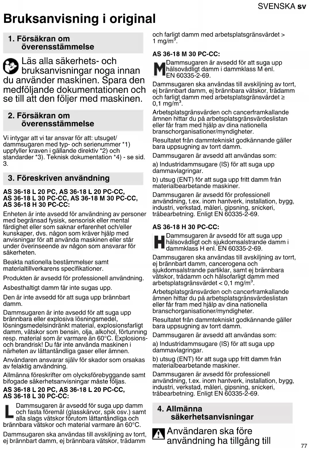 AS 36-18 L 20 PC, AS 36-18 L 20 PC-CC, AS 36-18 L 30 PC-CC, AS 36-18 M 30 PC-CC, AS 36-18 H 30 PC-CC: Enheten är inte avsedd för användning av personer med begränsad fysisk, sensorisk eller mental färdighet eller som saknar erfarenhet och/eller kunskaper, dvs. någon som kräver hjälp med anvisningar för att använda maskinen eller står under överinseende av någon som ansvarar för säkerheten. Beakta nationella bestämmelser samt materialtillverkarens specifikationer. Produkten är avsedd för professionell användning. Asbesthaltigt damm får inte sugas upp. Den är inte avsedd för att suga upp brännbart damm. Dammsugaren är inte avsedd för att suga upp brännbara eller explosiva lösningsmedel, lösningsmedelsindränkt material, explosionsfarligt damm, vätskor som bensin, olja, alkohol, förtunning resp. material som är varmare än 60°C. Explosions- och brandrisk! Du får inte använda maskinen i närheten av lättantändliga gaser eller ämnen. Användaren ansvarar själv för skador som orsakas av felaktig användning. Allmänna föreskrifter om olycksförebyggande samt bifogade säkerhetsanvisningar måste följas. AS 36-18 L 20 PC, AS 36-18 L 20 PC-CC, AS 36-18 L 30 PC-CC: Dammsugaren är avsedd för suga upp damm och fasta föremål (glasskärvor, spik osv.) samt alla slags vätskor förutom lättantändliga och brännbara vätskor och material varmare än 60°C. Dammsugaren ska användas till avskiljning av torrt, ej brännbart damm, ej brännbara vätskor, trädamm och farligt damm med arbetsplatsgränsvärdet > 1 mg/m³. AS 36-18 M 30 PC-CC: Dammsugaren är avsedd för att suga upp hälsovådligt damm i dammklass M enl. EN 60335-2-69. Dammsugaren ska användas till avskiljning av torrt, ej brännbart damm, ej brännbara vätskor, trädamm och farligt damm med arbetsplatsgränsvärdet ≥ 0,1 mg/m³. Arbetsplatsgränsvärden och cancerframkallande ämnen hittar du på arbetsplatsgränsvärdeslistan eller får fram med hjälp av dina nationella branschorganisationer/myndigheter. Resultatet från dammtekniskt godkännande gäller bara uppsugning av torrt damm. Dammsugaren är avsedd att användas som: a) Industridammsugare (IS) för att suga upp dammavlagringar. b) utsug (ENT) för att suga upp fritt damm från materialbearbetande maskiner. Dammsugaren är avsedd för professionell användning, t.ex. inom hantverk, installation, bygg, industri, verkstad, måleri, gipsning, snickeri, träbearbetning. Enligt EN 60335-2-69. AS 36-18 H 30 PC-CC: Dammsugaren är avsedd för att suga upp hälsovådligt och sjukdomsalstrande damm i dammklass H enl. EN 60335-2-69. Dammsugaren ska användas till avskiljning av torrt, ej brännbart damm, cancerogena och sjukdomsalstrande partiklar, samt ej brännbara vätskor, trädamm och hälsofarligt damm med arbetsplatsgränsvärdet < 0,1 mg/m³. Arbetsplatsgränsvärden och cancerframkallande ämnen hittar du på arbetsplatsgränsvärdeslistan eller får fram med hjälp av dina nationella branschorganisationer/myndigheter. Resultatet från dammtekniskt godkännande gäller bara uppsugning av torrt damm. Dammsugaren är avsedd att användas som: a) Industridammsugare (IS) för att suga upp dammavlagringar. b) utsug (ENT) för att suga upp fritt damm från materialbearbetande maskiner. Dammsugaren är avsedd för professionell användning, t.ex. inom hantverk, installation, bygg, industri, verkstad, måleri, gipsning, snickeri, träbearbetning. Enligt EN 60335-2-69. Användaren ska före användning ha tillgång till