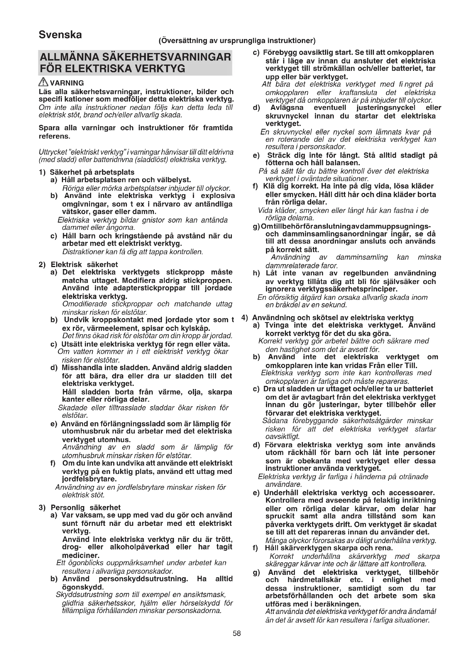 VARNING Läs alla säkerhetsvarningar, instruktioner, bilder och specifi kationer som medföljer detta elektriska verktyg. Om inte alla instruktioner nedan följs kan detta leda till elektrisk stöt, brand och/eller allvarlig skada. Spara alla varningar och instruktioner för framtida referens. Uttrycket ”elektriskt verktyg” i varningar hänvisar till ditt eldrivna (med sladd) eller batteridrivna (sladdlöst) elektriska verktyg.