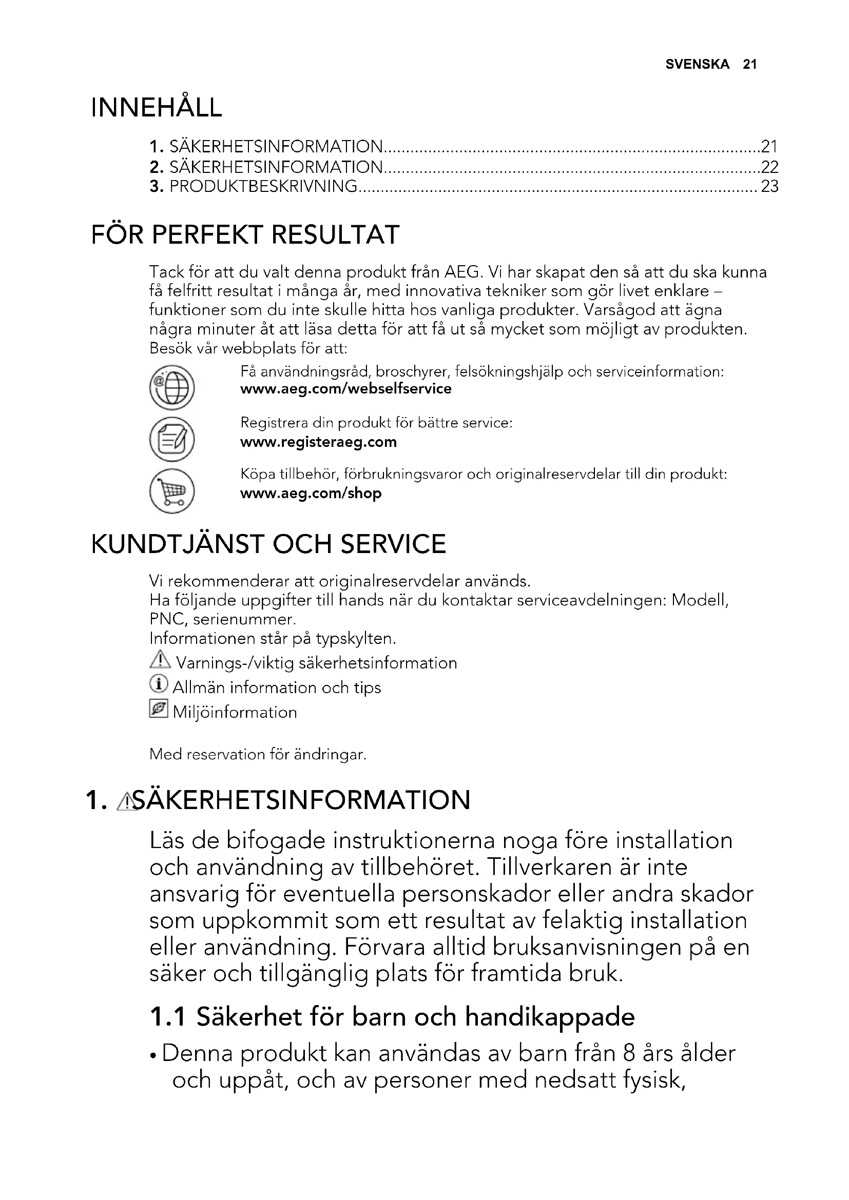 Tack för att du valt denna produkt från AEG. Vi har skapat den så att du ska kunna få felfritt resultat i många år, med innovativa tekniker som gör livet enklare – funktioner som du inte skulle hitta hos vanliga produkter. Varsågod att ägna några minuter åt att läsa detta för att få ut så mycket som möjligt av produkten. Besök vår webbplats för att: Få användningsråd, broschyrer, felsökningshjälp och serviceinformation: www.aeg.com/webselfservice Registrera din produkt för bättre service: www.registeraeg.com Köpa tillbehör, förbrukningsvaror och originalreservdelar till din produkt: www.aeg.com/shop