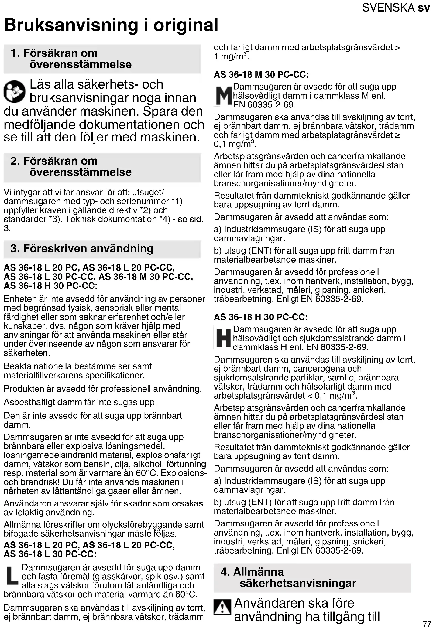 AS 36-18 L 20 PC, AS 36-18 L 20 PC-CC, AS 36-18 L 30 PC-CC, AS 36-18 M 30 PC-CC, AS 36-18 H 30 PC-CC: Enheten är inte avsedd för användning av personer med begränsad fysisk, sensorisk eller mental färdighet eller som saknar erfarenhet och/eller kunskaper, dvs. någon som kräver hjälp med anvisningar för att använda maskinen eller står under överinseende av någon som ansvarar för säkerheten. Beakta nationella bestämmelser samt materialtillverkarens specifikationer. Produkten är avsedd för professionell användning. Asbesthaltigt damm får inte sugas upp. Den är inte avsedd för att suga upp brännbart damm. Dammsugaren är inte avsedd för att suga upp brännbara eller explosiva lösningsmedel, lösningsmedelsindränkt material, explosionsfarligt damm, vätskor som bensin, olja, alkohol, förtunning resp. material som är varmare än 60°C. Explosions- och brandrisk! Du får inte använda maskinen i närheten av lättantändliga gaser eller ämnen. Användaren ansvarar själv för skador som orsakas av felaktig användning. Allmänna föreskrifter om olycksförebyggande samt bifogade säkerhetsanvisningar måste följas. AS 36-18 L 20 PC, AS 36-18 L 20 PC-CC, AS 36-18 L 30 PC-CC: Dammsugaren är avsedd för suga upp damm och fasta föremål (glasskärvor, spik osv.) samt alla slags vätskor förutom lättantändliga och brännbara vätskor och material varmare än 60°C. Dammsugaren ska användas till avskiljning av torrt, ej brännbart damm, ej brännbara vätskor, trädamm och farligt damm med arbetsplatsgränsvärdet > 1 mg/m³. AS 36-18 M 30 PC-CC: Dammsugaren är avsedd för att suga upp hälsovådligt damm i dammklass M enl. EN 60335-2-69. Dammsugaren ska användas till avskiljning av torrt, ej brännbart damm, ej brännbara vätskor, trädamm och farligt damm med arbetsplatsgränsvärdet ≥ 0,1 mg/m³. Arbetsplatsgränsvärden och cancerframkallande ämnen hittar du på arbetsplatsgränsvärdeslistan eller får fram med hjälp av dina nationella branschorganisationer/myndigheter. Resultatet från dammtekniskt godkännande gäller bara uppsugning av torrt damm. Dammsugaren är avsedd att användas som: a) Industridammsugare (IS) för att suga upp dammavlagringar. b) utsug (ENT) för att suga upp fritt damm från materialbearbetande maskiner. Dammsugaren är avsedd för professionell användning, t.ex. inom hantverk, installation, bygg, industri, verkstad, måleri, gipsning, snickeri, träbearbetning. Enligt EN 60335-2-69. AS 36-18 H 30 PC-CC: Dammsugaren är avsedd för att suga upp hälsovådligt och sjukdomsalstrande damm i dammklass H enl. EN 60335-2-69. Dammsugaren ska användas till avskiljning av torrt, ej brännbart damm, cancerogena och sjukdomsalstrande partiklar, samt ej brännbara vätskor, trädamm och hälsofarligt damm med arbetsplatsgränsvärdet < 0,1 mg/m³. Arbetsplatsgränsvärden och cancerframkallande ämnen hittar du på arbetsplatsgränsvärdeslistan eller får fram med hjälp av dina nationella branschorganisationer/myndigheter. Resultatet från dammtekniskt godkännande gäller bara uppsugning av torrt damm. Dammsugaren är avsedd att användas som: a) Industridammsugare (IS) för att suga upp dammavlagringar. b) utsug (ENT) för att suga upp fritt damm från materialbearbetande maskiner. Dammsugaren är avsedd för professionell användning, t.ex. inom hantverk, installation, bygg, industri, verkstad, måleri, gipsning, snickeri, träbearbetning. Enligt EN 60335-2-69. Användaren ska före användning ha tillgång till