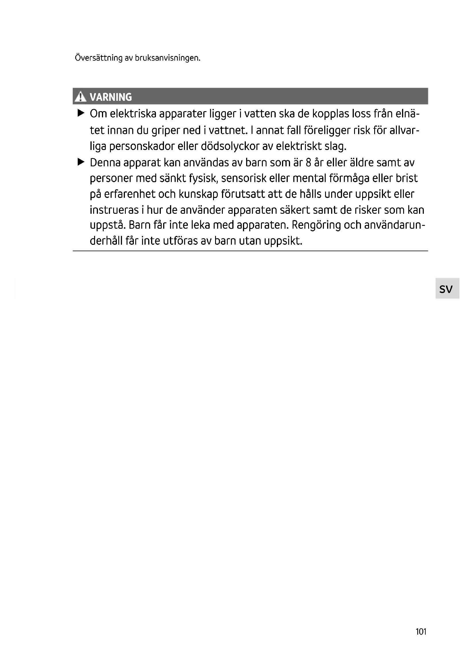 VARNING Om elektriska apparater ligger i vatten ska de kopplas loss från elnä- tet innan du griper ned i vattnet. I annat fall föreligger risk för allvar- liga personskador eller dödsolyckor av elektriskt slag. Denna apparat kan användas av barn som är 8 år eller äldre samt av personer med sänkt fysisk, sensorisk eller mental förmåga eller brist på erfarenhet och kunskap förutsatt att de hålls under uppsikt eller instrueras i hur de använder apparaten säkert samt de risker som kan uppstå. Barn får inte leka med apparaten. Rengöring och användarun- derhåll får inte utföras av barn utan uppsikt.102 Säkerhetsanvisningar Elanslutning