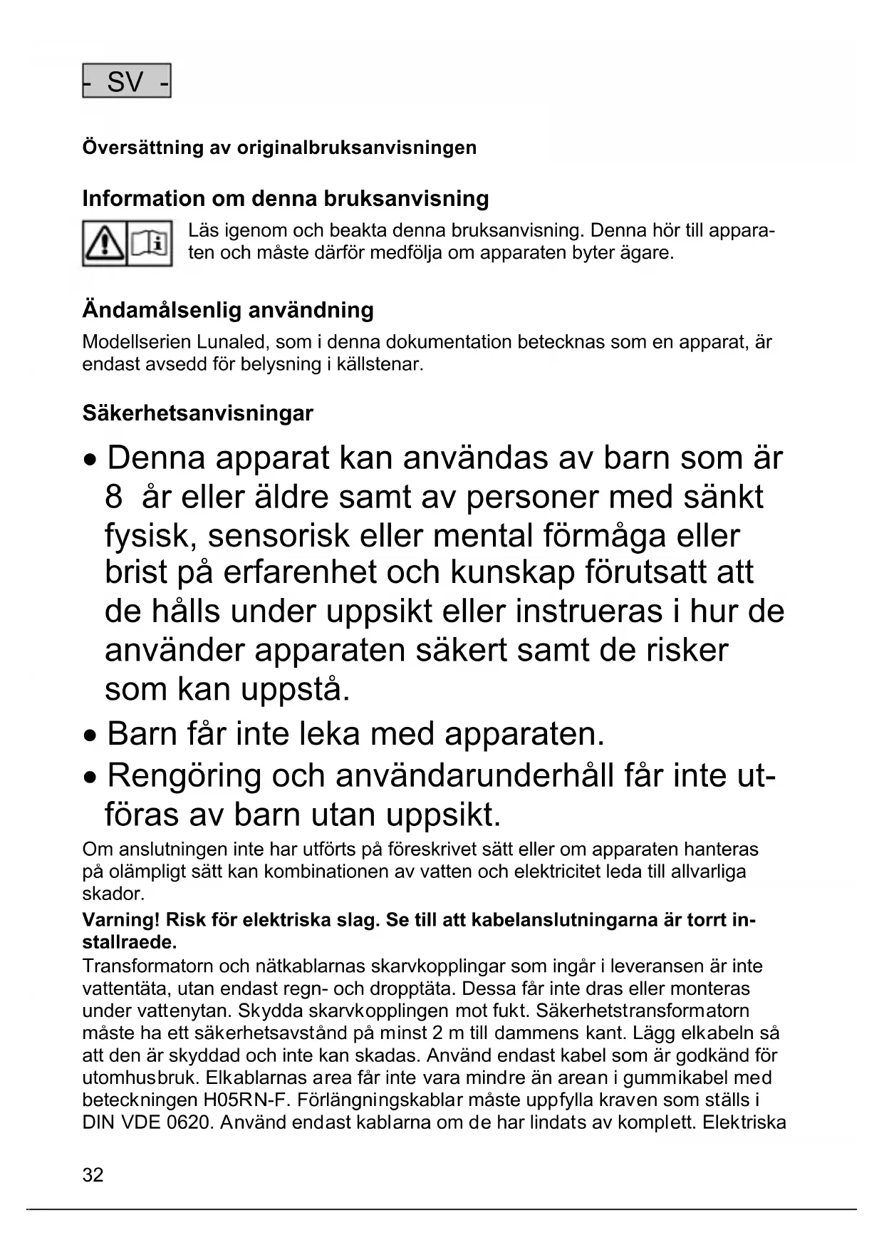 Ändamålsenlig användning Modellserien Lunaled, som i denna dokumentation betecknas som en apparat, är endast avsedd för belysning i källstenar.