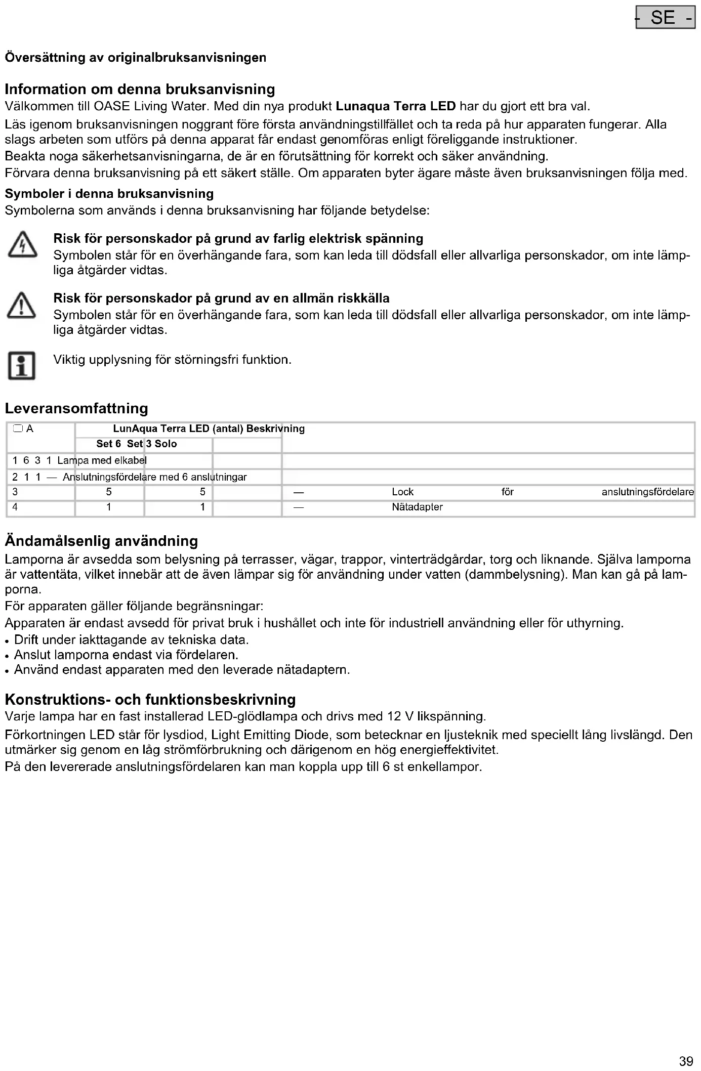 - SE - Översättning av originalbruksanvisningen Information om denna bruksanvisning Välkommen till OASE Living Water. Med din nya produkt Lunaqua Terra LED har du gjort ett bra val. Läs igenom bruksanvisningen noggrant före första användningstillfället och ta reda på hur apparaten fungerar. Alla slags arbeten som utförs på denna apparat får endast genomföras enligt föreliggande instruktioner. Beakta noga säkerhetsanvisningarna, de är en förutsättning för korrekt och säker användning. Förvara denna bruksanvisning på ett säkert ställe. Om apparaten byter ägare måste även bruksanvisningen följa med. Symboler i denna bruksanvisning Symbolerna som används i denna bruksanvisning har följande betydelse: