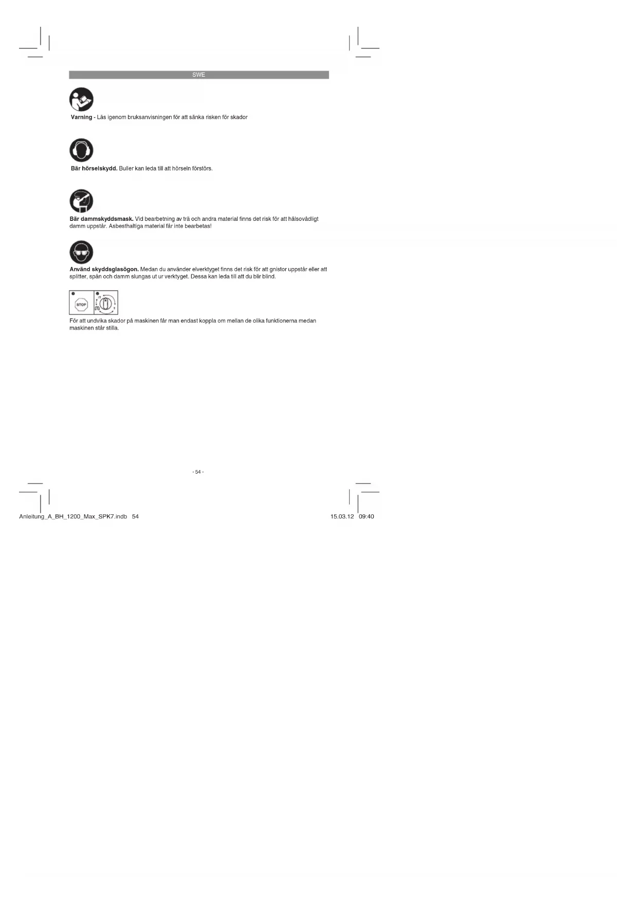 Varning - Läs igenom bruksanvisningen för att sänka risken för skador Bär hörselskydd. Buller kan leda till att hörseln förstörs. Använd skyddsglasögon. Medan du använder elverktyget fi nns det risk för att gnistor uppstår eller att splitter, spån och damm slungas ut ur verktyget. Dessa kan leda till att du blir blind. Bär dammskyddsmask. Vid bearbetning av trä och andra material fi nns det risk för att hälsovådligt damm uppstår. Asbesthaltiga material får inte bearbetas! För att undvika skador på maskinen får man endast koppla om mellan de olika funktionerna medan maskinen står stilla. Anleitung_A_BH_1200_Max_SPK7.indb 54Anleitung_A_BH_1200_Max_SPK7.indb 54 15.03.12 09:4015.03.12 09:40SWE