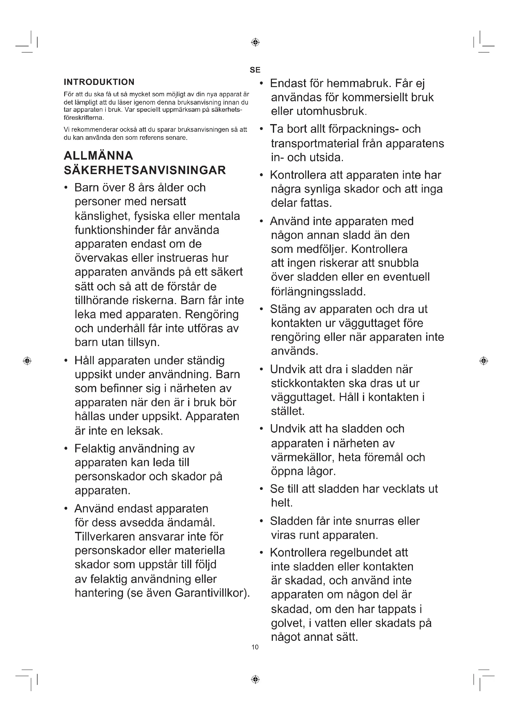 INTRODUKTION För att du ska få ut så mycket som möjligt av din nya apparat är det lämpligt att du läser igenom denna bruksanvisning innan du tar apparaten i bruk. Var speciellt uppmärksam på säkerhets- föreskrifterna. Vi rekommenderar också att du sparar bruksanvisningen så att du kan använda den som referens senare. ALLMÄNNA SÄKERHETSANVISNINGAR