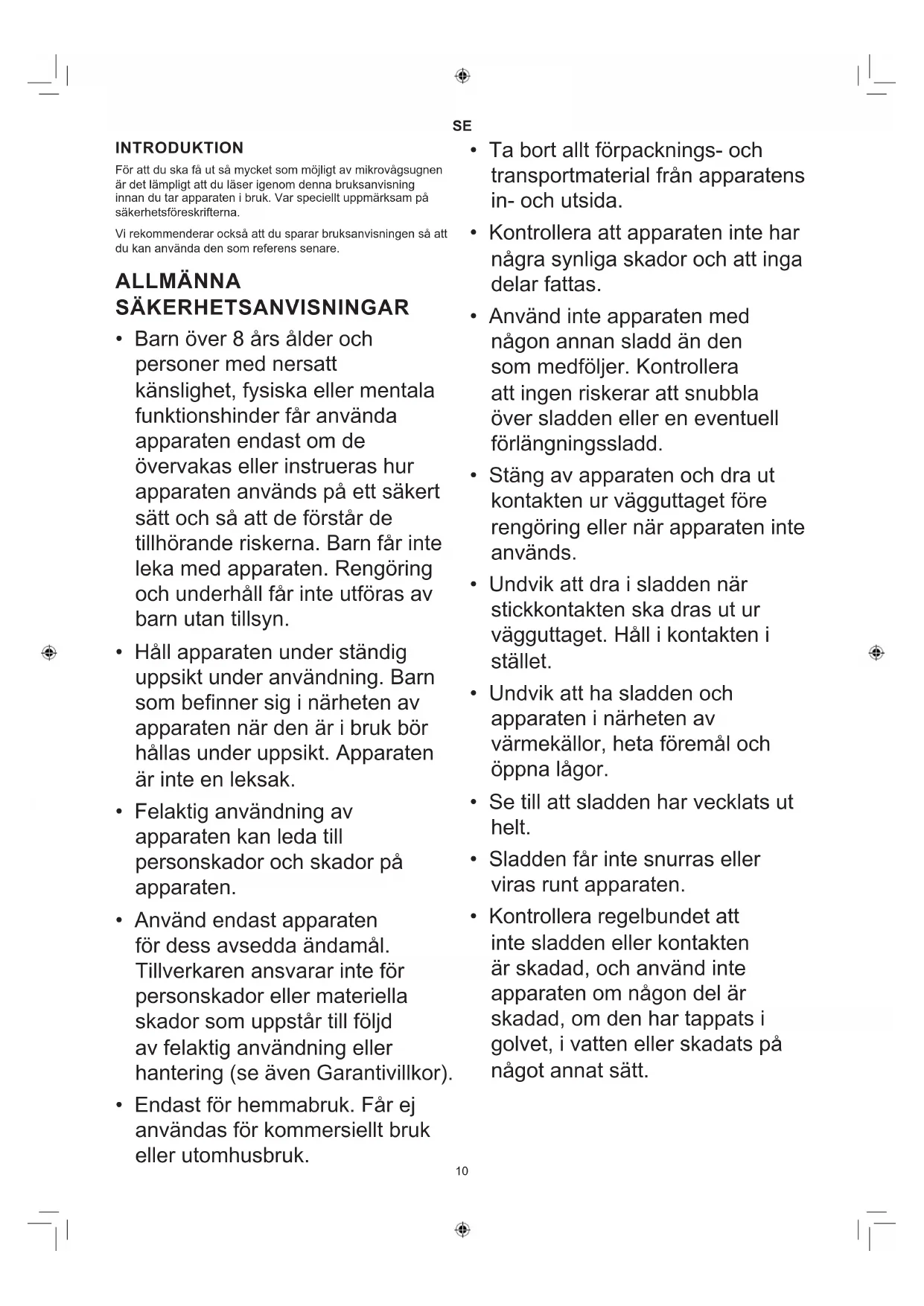 INTRODUKTION För att du ska få ut så mycket som möjligt av mikrovågsugnen är det lämpligt att du läser igenom denna bruksanvisning innan du tar apparaten i bruk. Var speciellt uppmärksam på säkerhetsföreskrifterna. Vi rekommenderar också att du sparar bruksanvisningen så att du kan använda den som referens senare. ALLMÄNNA SÄKERHETSANVISNINGAR