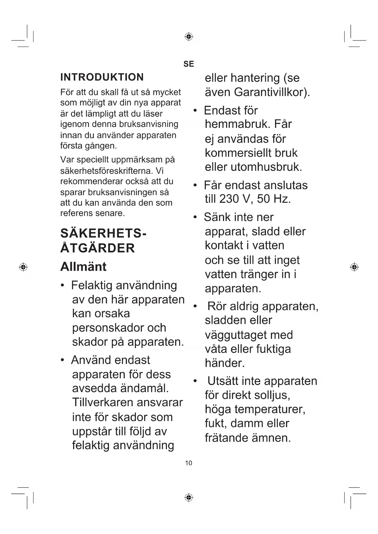 INTRODUKTION Förattduskallfåutsåmycket sommöjligtavdinnyaapparat ärdetlämpligtattduläser igenomdennabruksanvisning innanduanvänderapparaten första gången. Varspecielltuppmärksampå säkerhetsföreskrifterna. Vi rekommenderar också att du spararbruksanvisningenså att du kan använda den som referens senare. SÄKERHETS- ÅTGÄRDER Allmänt