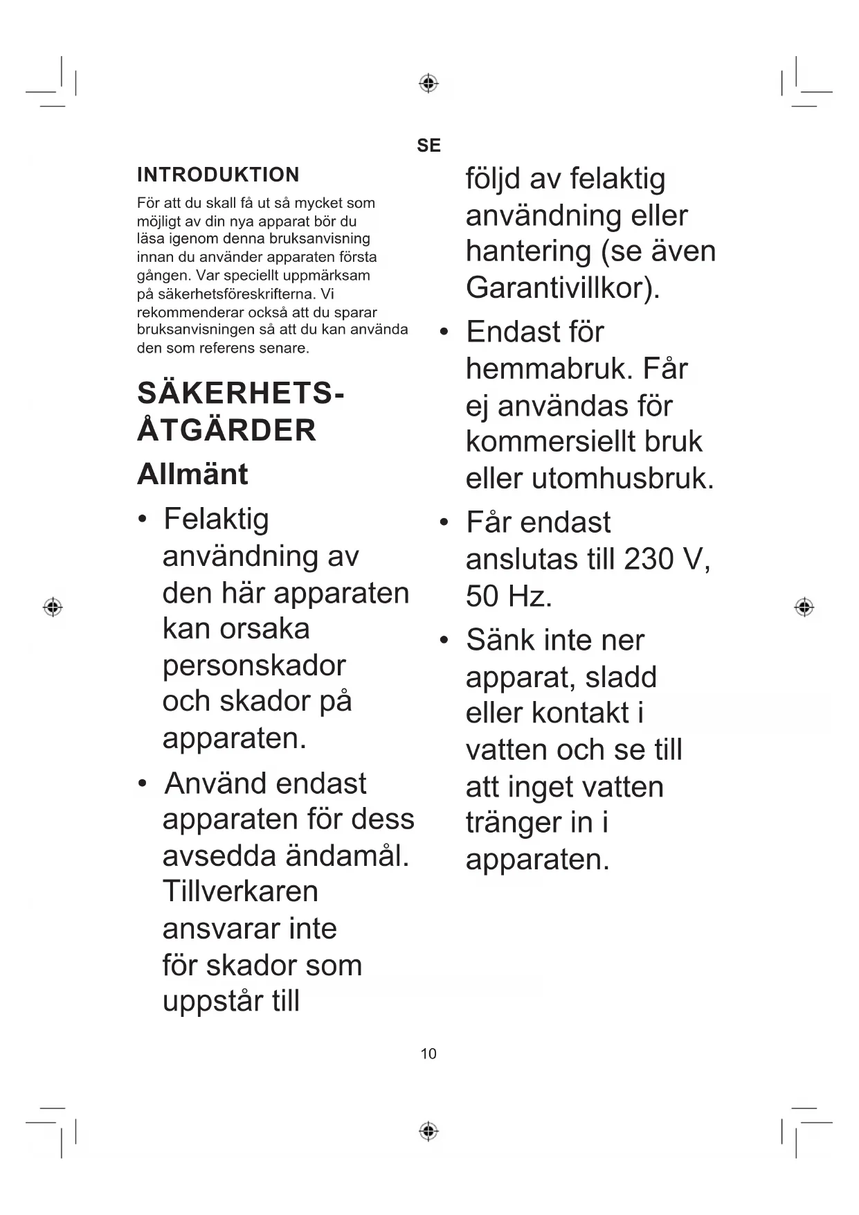 INTRODUKTION För att du skall få ut så mycket som möjligt av din nya apparat bör du läsa igenom denna bruksanvisning innan du använder apparaten första gången. Var speciellt uppmärksam på säkerhetsföreskrifterna. Vi rekommenderar också att du sparar bruksanvisningen så att du kan använda den som referens senare. SÄKERHETS- ÅTGÄRDER Allmänt