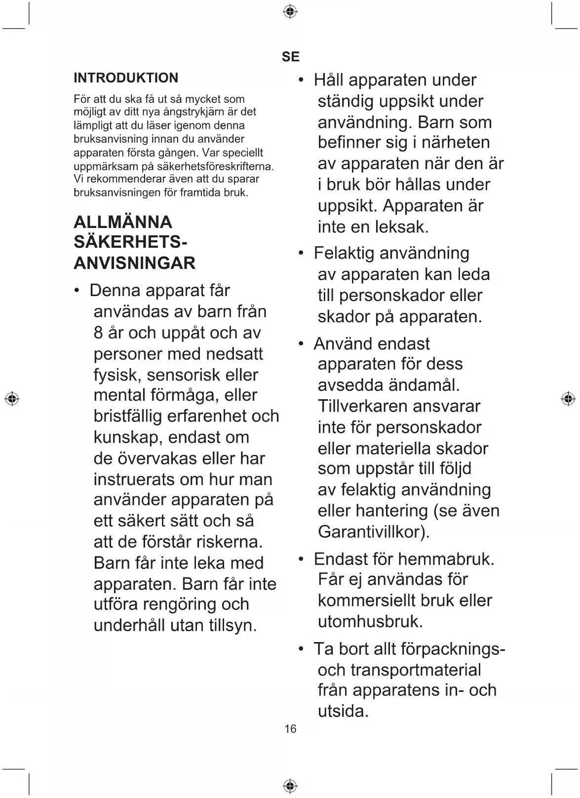 INTRODUKTION För att du ska få ut så mycket som möjligt av ditt nya ångstrykjärn är det lämpligt att du läser igenom denna bruksanvisning innan du använder apparaten första gången. Var speciellt uppmärksam på säkerhetsföreskrifterna. Vi rekommenderar även att du sparar bruksanvisningen för framtida bruk. ALLMÄNNA SÄKERHETS- ANVISNINGAR