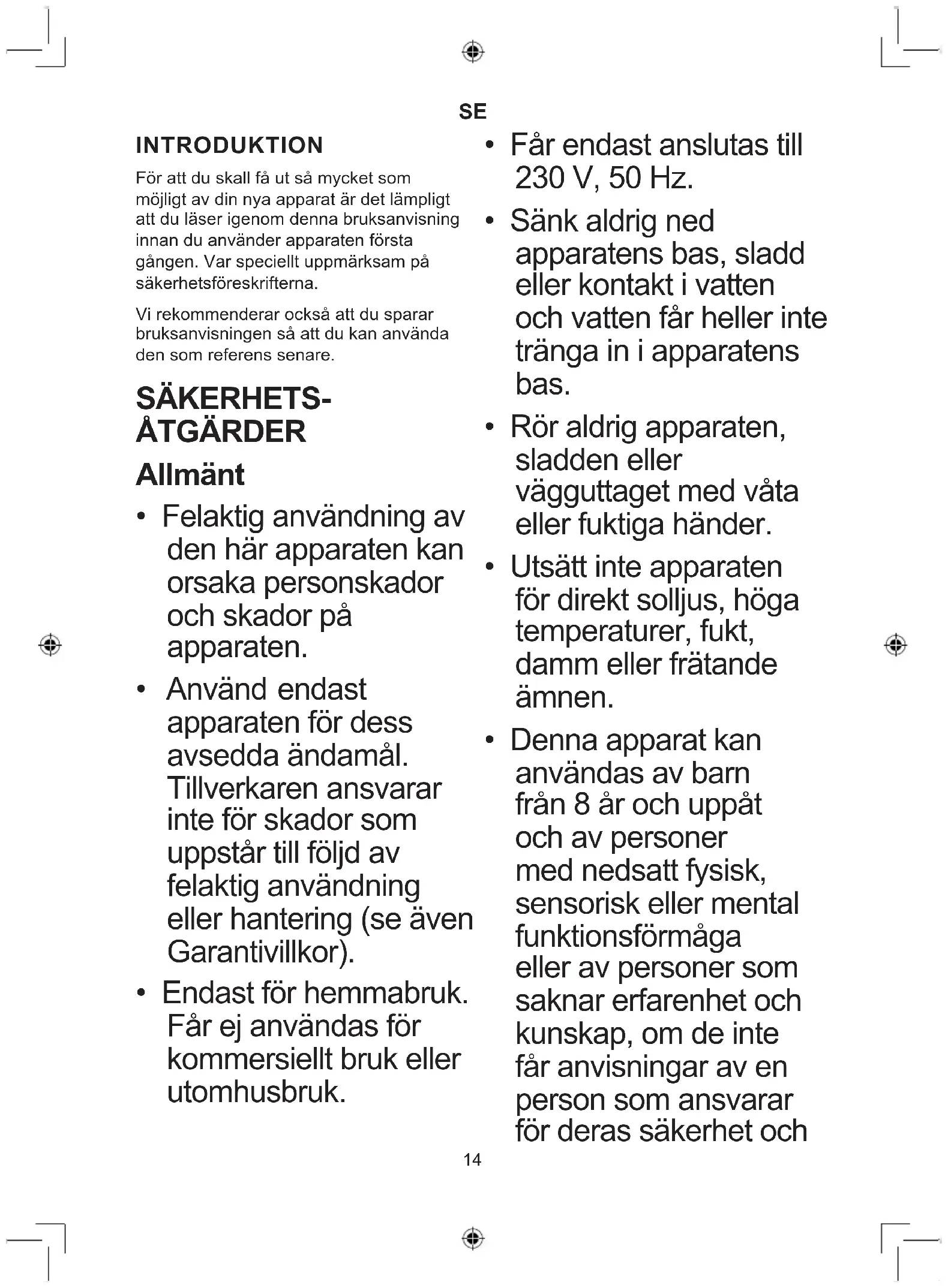 INTRODUKTION För att du skall få ut så mycket som möjligt av din nya apparat är det lämpligt att du läser igenom denna bruksanvisning innan du använder apparaten första gången. Var speciellt uppmärksam på säkerhetsföreskrifterna. Vi rekommenderar också att du sparar bruksanvisningen så att du kan använda den som referens senare. SÄKERHETS- ÅTGÄRDER Allmänt