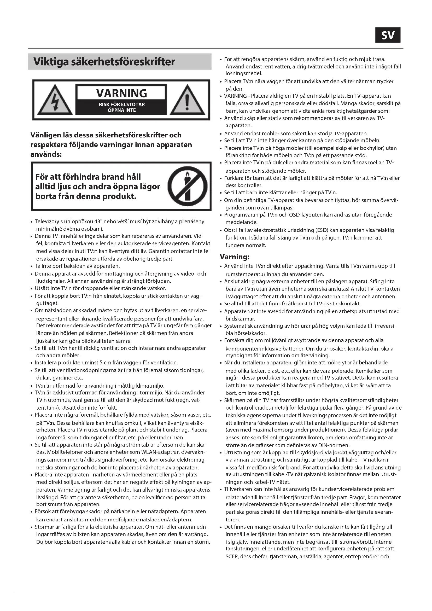 - VARNING - Placera aldrig en TV på en instabil plats. En TV-apparat kan falla, orsaka allvarlig personskada eller dödsfall. Många skador, särskilt på barn, kan undvikas genom att vidta enkla försiktighetsåtgärder som: