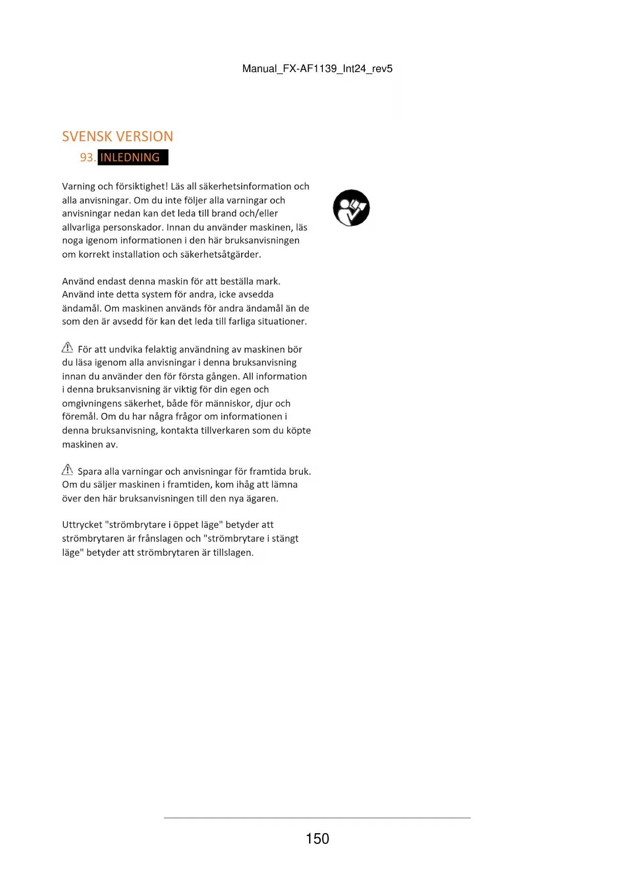 Varning och försiktighet! Läs all säkerhetsinformation och alla anvisningar. Om du inte följer alla varningar och anvisningar nedan kan det leda till brand och/eller allvarliga personskador. Innan du använder maskinen, läs noga igenom informationen i den här bruksanvisningen om korrekt installation och säkerhetsåtgärder. Använd endast denna maskin för att beställa mark. Använd inte detta system för andra, icke avsedda ändamål. Om maskinen används för andra ändamål än de som den är avsedd för kan det leda till farliga situationer. För att undvika felaktig användning av maskinen bör du läsa igenom alla anvisningar i denna bruksanvisning innan du använder den för första gången. All information i denna bruksanvisning är viktig för din egen och omgivningens säkerhet, både för människor, djur och föremål. Om du har några frågor om informationen i denna bruksanvisning, kontakta tillverkaren som du köpte maskinen av. Spara alla varningar och anvisningar för framtida bruk. Om du säljer maskinen i framtiden, kom ihåg att lämna över den här bruksanvisningen till den nya ägaren. Uttrycket "strömbrytare i öppet läge" betyder att strömbrytaren är frånslagen och "strömbrytare i stängt läge" betyder att strömbrytaren är tillslagen.Manual_FX-AF1139_Int24_rev5
