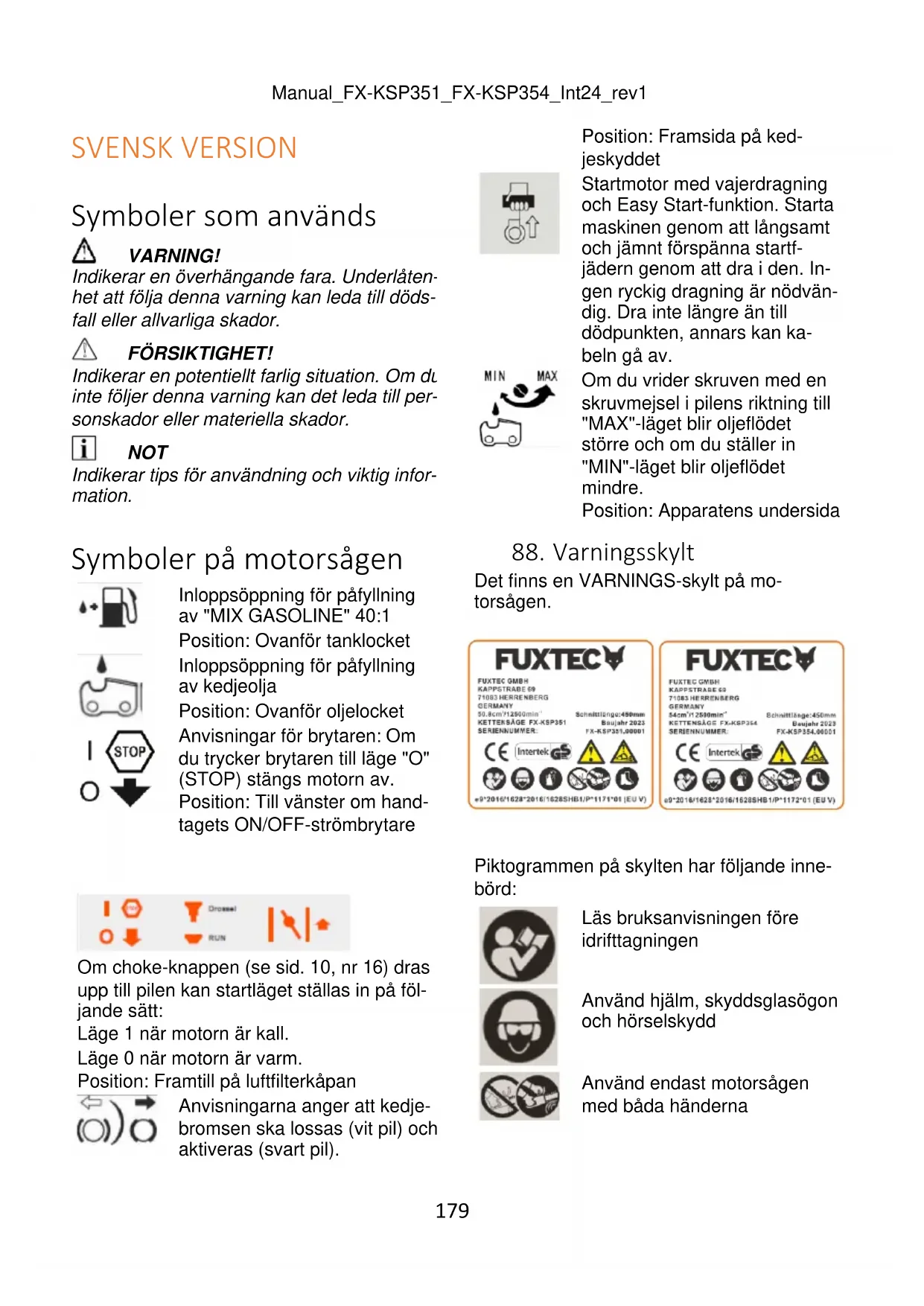 VARNING! Risk för olycka! Kedjebromsens funktion är mycket viktig för motorsågens säkerhet. En felaktig kedje- broms kan leda till allvarliga skador eller till och med dödsfall om kedjesågen slår tillbakaManual_FX-KSP351_FX-KSP354_Int24_rev1