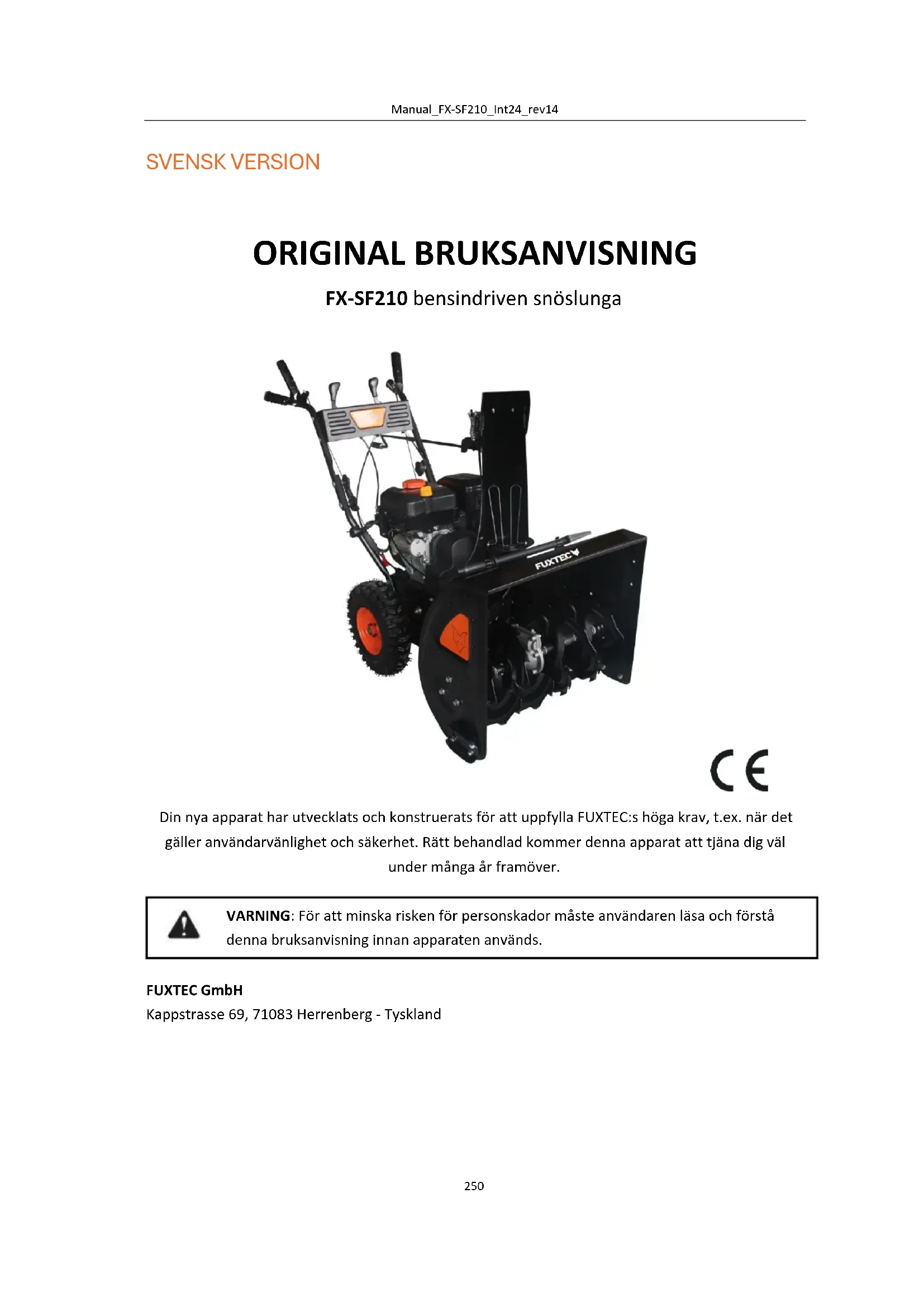 Din nya apparat har utvecklats och konstruerats för att uppfylla FUXTEC:s höga krav, t.ex. när det gäller användarvänlighet och säkerhet. Rätt behandlad kommer denna apparat att tjäna dig väl under många år framöver. VARNING: För att minska risken för personskador måste användaren läsa och förstå denna bruksanvisning innan apparaten används. FUXTEC GmbH Kappstrasse 69, 71083 Herrenberg - TysklandManual_FX-SF210_Int24_rev14
