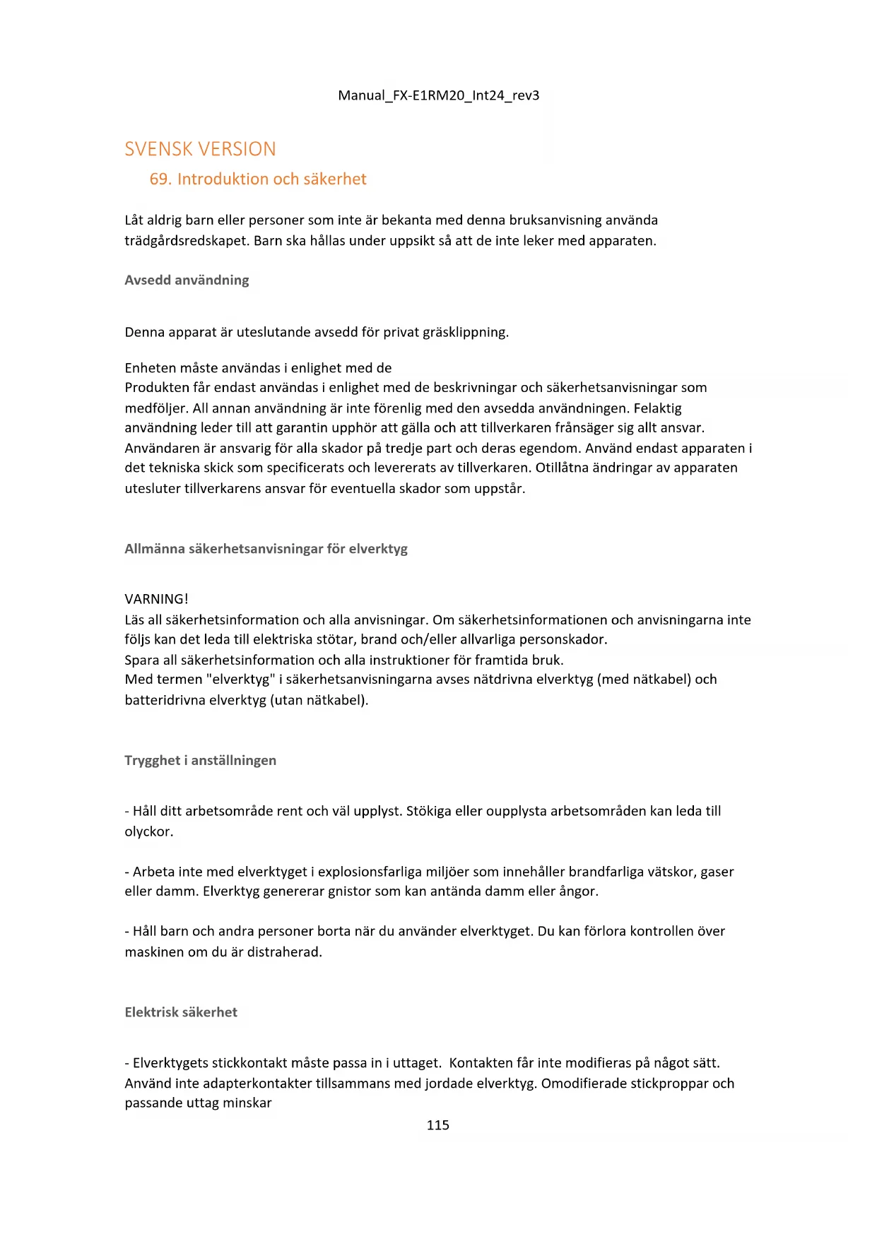 Allmänna säkerhetsanvisningar - För din egen och andras säkerhet bör du läsa igenom denna bruksanvisning och dess säkerhetsföreskrifter innan du använder apparaten. Förvara bruksanvisningen och säkerhetsanvisningarna säkerhetsanvisningarna för senare användning och förvara dem säkert för framtida bruk. redo att användas för alla ändamål. - Lämna över bruksanvisningen tillsammans med apparaten om den byter ägare. - Personer som använder apparaten får inte vara påverkade av berusningsmedel (t.ex. alkohol, droger eller mediciner). - Använd endast apparaten i det driftläge som föreskrivs och tillhandahålls av tillverkaren. tekniskt skick. Otillåtna ändringar av apparaten utesluter tillverkarens ansvar för eventuella skador som uppkommer. - Använd endast apparaten i dagsljus eller under god artificiell belysning. - Använd endast enheten i torra väderförhållanden. Håll den borta från regn eller våta förhållanden. Om vatten tränger in i apparaten ökar risken för elektriska stötar. - Stäng av apparaten och ta ut batteriet under följande förhållanden: ⬧ om apparaten lämnas utan uppsikt; ⬧ innan du kontrollerar, rengör eller utför andra arbeten på apparaten; ⬧ om apparaten börjar vibrera för mycket. Före användning - Bekanta dig med apparaten och dess funktioner och reglage innan du påbörjar arbetet. - Kontrollera apparaten för tecken på slitage eller skador före idrifttagning och efter en kollision. - Använd inte en apparat vars strömbrytare är defekt och inte längre kan slås på eller av.Manual_FX-E1RM20_Int24_rev3