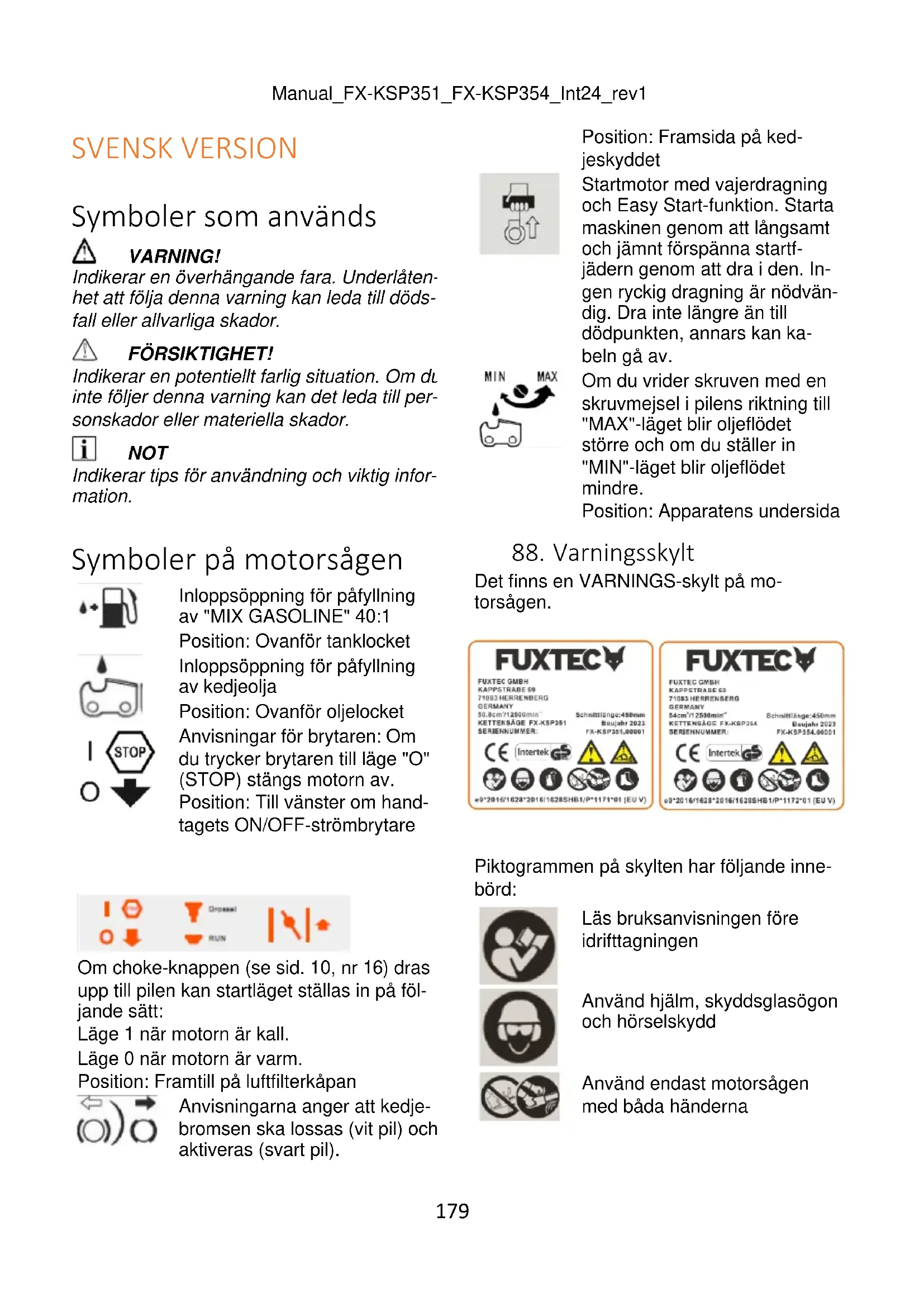 Lita därför inte enbart på de inbyggda sä- kerhetsfunktionerna i din motorsåg. Som användare av motorsågen måste du vidta dina egna försiktighetsåtgärder för att säkerställa att du kan utföra allt arbete med sågen utan olyckor eller skador. ◼ Håll alltid motorsågen med båda händerna när motorn är igång. Höger hand på det bakre handtaget och vänster hand på det främre handtaget. Ta ett stadigt grepp om handtagen med hela handen. Ett fast grepp minskar rekyleffekten och hjälper dig att hålla apparaten under kontroll. ◼ Se till att arbetsområdet är fritt från hinder. Se till att styrskenans spets inte kommer i kontakt med andra stammar, grenar eller hinder vid kapningen. Detta kan orsaka en olycka. ◼ Utför alltid kapningen med hög motorhas- tighet. ◼ Se till att du har bra balans när du klipper och sträck inte armarna för långt framåt. ◼ Klipp inte över axelhöjd. ◼ Följ tillverkarens anvisningar vid underhåll och slipning av kedjan. ◼ Montera endast reservdelar som rekom- menderas av tillverkaren om svärdet eller sågkedjan behöver bytas ut. Risk för kvävning på grund av kol- monoxid! ◼ Förbränningsmotorn får endast köras utomhus. Explosions- och brandrisk! Bensinångor är explosiva och bensin är mycket brandfarligt. ◼ Fyll tanken med bränsle innan du startar motorn. Håll tanken stängd när motorn är igång eller fortfarande är varm. ◼ Fyll endast på bränsle när motorn är avstängd och har svalnat. Undvik öppen eld, gnistor och rök inte. Tanka endast ap- paraten utomhus. ◼ Starta inte motorn om bränsle har runnit ut. Avlägsna motorsågen från det bräns- leförorenade området och vänta tills bränsleångorna har försvunnit. ◼ För att undvika brandrisk ska följande delar hållas fria från läckande olja eller bränsle: − Motor, − Avgaserna, − Bensintank. Trygghet i anställningen ◼ Håll ditt arbetsområde rent och väl upp- lyst. Stökiga eller oupplysta arbetsom- råden kan leda till olyckor. ◼ Arbeta inte med motorsågen i explo- sionsfarliga miljöer. Detta gäller i synner- het platser där det finns brandfarliga väts- kor, gaser eller damm. ◼ Håll barn och andra obehöriga perso- ner borta från arbetsområdet när du an- vänder motorsågen. Sådana distraktio- ner kan leda till att du tappar kontrollen ö- ver motorsågen. Säkerhet för personer ◼ Var uppmärksam, tänk på vad du gör och använd sunt förnuft när du arbetar med motorsågen. Använd inte mo- torsåg när du är trött eller påverkad av droger, alkohol eller läkemedel. Ett ögonblick av oaktsamhet vid arbete med motorsåg kan leda till allvarliga ska- dor. ◼ Använd personlig skyddsutrustning och alltid skyddsglasögon. Användning av personlig skyddsutrustning som t.ex. dammskyddsmask, halkfria skyddsskor, skyddshjälm och hörselskydd minskar ris- ken för skador. ◼ Använd lämpliga kläder. Bär inte löst sittande kläder eller smycken. Håll hår, kläder och handskar borta från rörliga delar. Lösa kläder, smycken eller långt hår kan fastna i rörliga delar. ◼ Undvik onormal kroppshållning. Se till att du står stadigt och behåll balansen hela tiden. På så sätt kan du kontrollera motorsågen bättre i oväntade situationer.Manual_FX-KSP351_FX-KSP354_Int24_rev1