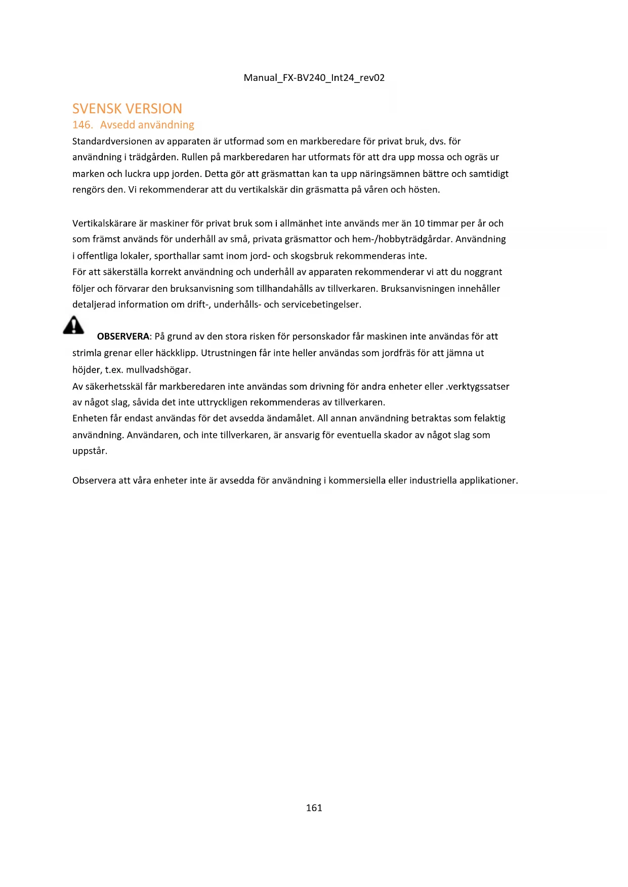 Standardversionen av apparaten är utformad som en markberedare för privat bruk, dvs. för användning i trädgården. Rullen på markberedaren har utformats för att dra upp mossa och ogräs ur marken och luckra upp jorden. Detta gör att gräsmattan kan ta upp näringsämnen bättre och samtidigt rengörs den. Vi rekommenderar att du vertikalskär din gräsmatta på våren och hösten. Vertikalskärare är maskiner för privat bruk som i allmänhet inte används mer än 10 timmar per år och som främst används för underhåll av små, privata gräsmattor och hem-/hobbyträdgårdar. Användning i offentliga lokaler, sporthallar samt inom jord- och skogsbruk rekommenderas inte. För att säkerställa korrekt användning och underhåll av apparaten rekommenderar vi att du noggrant följer och förvarar den bruksanvisning som tillhandahålls av tillverkaren. Bruksanvisningen innehåller detaljerad information om drift-, underhålls- och servicebetingelser. OBSERVERA: På grund av den stora risken för personskador får maskinen inte användas för att strimla grenar eller häckklipp. Utrustningen får inte heller användas som jordfräs för att jämna ut höjder, t.ex. mullvadshögar. Av säkerhetsskäl får markberedaren inte användas som drivning för andra enheter eller .verktygssatser av något slag, såvida det inte uttryckligen rekommenderas av tillverkaren. Enheten får endast användas för det avsedda ändamålet. All annan användning betraktas som felaktig användning. Användaren, och inte tillverkaren, är ansvarig för eventuella skador av något slag som uppstår. Observera att våra enheter inte är avsedda för användning i kommersiella eller industriella applikationer.Manual_FX-BV240_Int24_rev02