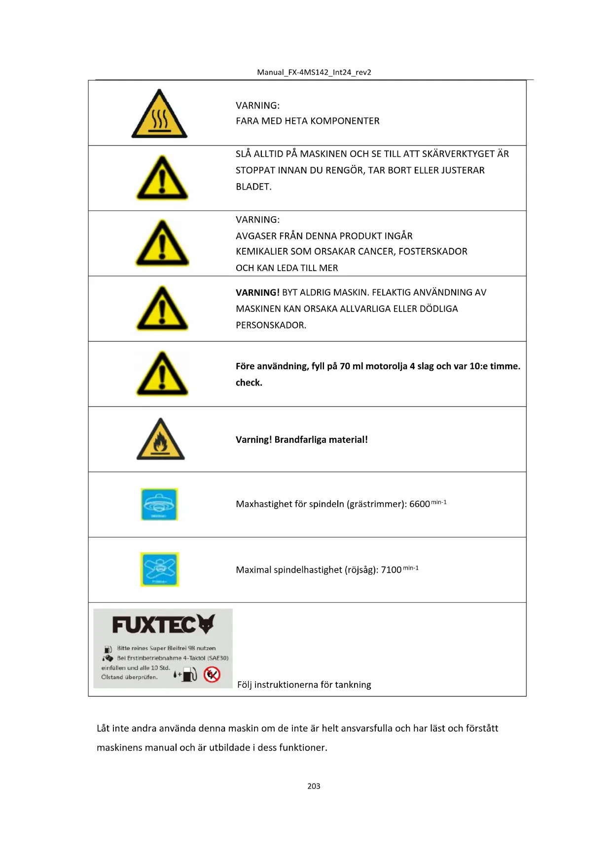⚫ Förvara inte maskinen i ett slutet utrymme där bränsleångor kan nå en öppen eld från varmvattenberedare, ugnar etc. Förvara maskinen i ett välventilerat utrymme. ⚫ Se till att din produkt endast är utrustad med originaltillbehör. Dessa delar finns tillgängliga hos din återförsäljare. Användning av annan extrautrustning eller tillbehör kan orsaka skador på användare och skador på maskinen. ⚫ Rengör motorn helt, särskilt bränsletanken och luftfiltret. Efter användning av enheten måste allt bränsle laddas ur. avlägsna. ⚫ VIKTIGT: När du fyller på bränsle, se till att maskinen är avstängd och nedkyld. Tanka aldrig när maskinen är igång eller varm. Om bensin spills, torka upp det innan du startar maskinen. ⚫ Håll minst 15 m avstånd till andra människor när du arbetar. ⚫ När du som åskådare närmar dig en användare av maskinen ska du noggrant fånga deras uppmärksamhet och bekräfta att användaren stoppar maskinen. Skräm eller distrahera inte användaren, annars kan du orsaka en osäker situation. ⚫ Rör aldrig vid skärhuvudet av nylon eller metallbladet när maskinen är igång. Om det är nödvändigt att byta ut skyddet eller skärverktyget, se till att maskinen och skärverktygen har stannat. ⚫ Maskinen måste vara AV innan du byter arbetsområde på maskinen. ⚫ Se till att skärhuvudet av nylon inte träffar stenar eller andra hårda föremål. ⚫ Se alltid till att skruvarna inte har lossnat eller att maskinen inte överhettas. ⚫ Låt vid behov maskinen servas av en auktoriserad återförsäljare. Om maskinen är defekt, fortsätt inte att köra den.Manual_FX-4MS142_Int24_rev2