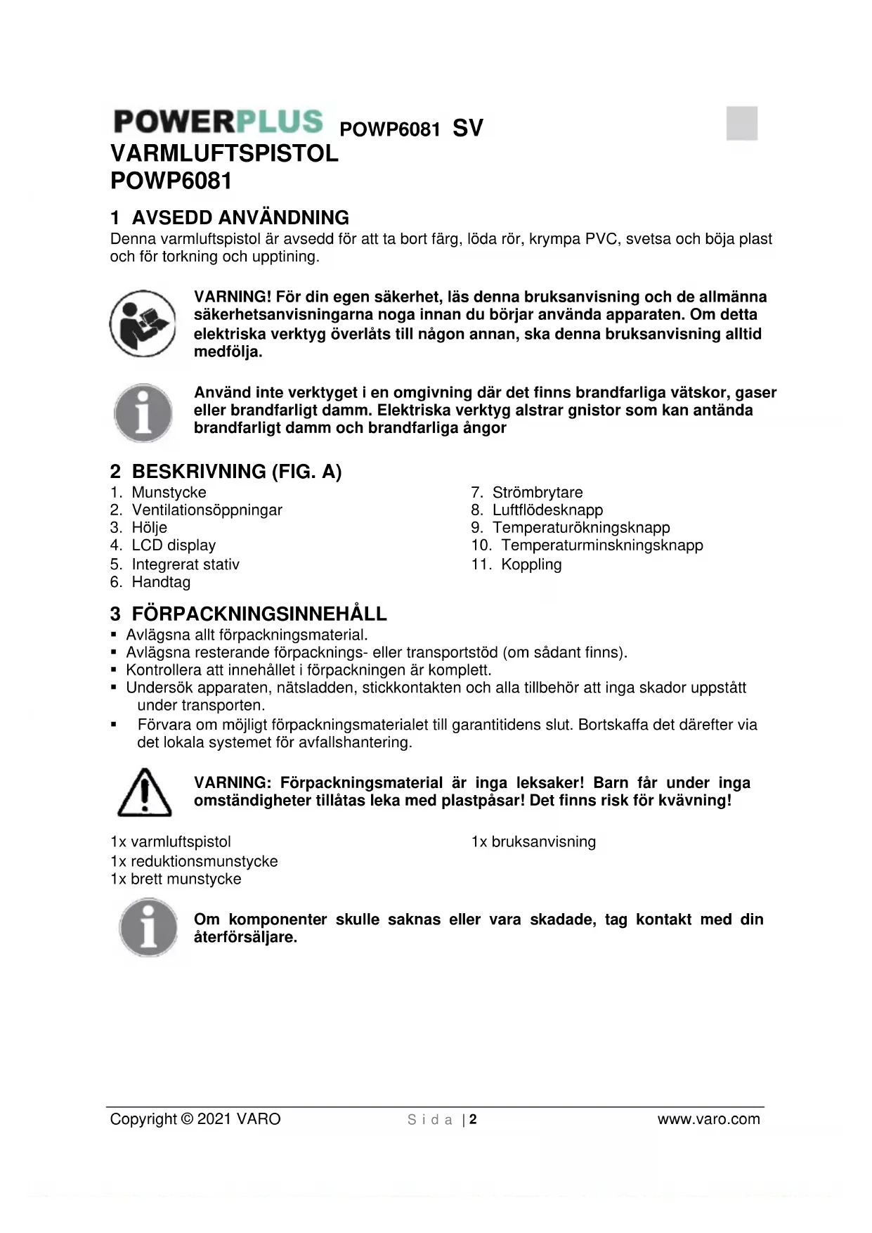 - Denna utrustning får inte användas av barn eller personer som är fysiskt eller mentalt försvagade, eller personer som saknar erfarenhet eller kännedom om detta slags apparatur, utom i det fall dessa personer står under vägledning av en person som ansvarar för deras säkerhet, en övervakare, och som studerat dessa anvisningar beträffande utrustningens användningPOWP6081 SV Copyright © 2021 VARO S i d a | 5 www.varo.com