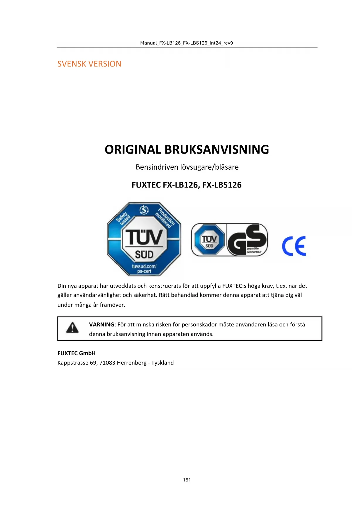 Din nya apparat har utvecklats och konstruerats för att uppfylla FUXTEC:s höga krav, t.ex. när det gäller användarvänlighet och säkerhet. Rätt behandlad kommer denna apparat att tjäna dig väl under många år framöver. VARNING: För att minska risken för personskador måste användaren läsa och förstå denna bruksanvisning innan apparaten används. FUXTEC GmbH Kappstrasse 69, 71083 Herrenberg - TysklandManual_FX-LB126_FX-LBS126_Int24_rev9