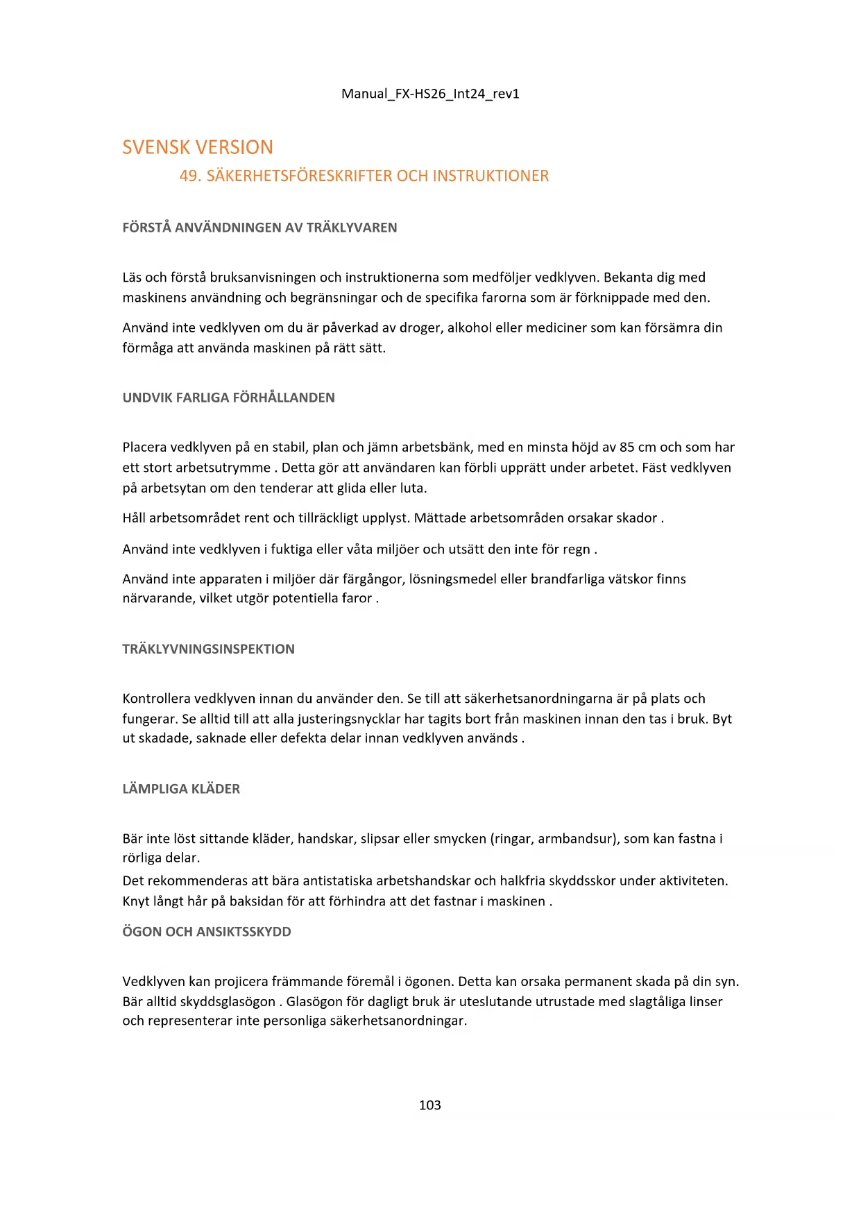 Se till att det inte finns några spikar eller främmande kroppar i stockarna som ska kapas. Ändarna på stockarna måste skäras vinkelrätt. Grenarna ska kapas i samma nivå som stammen . YTTERLIGARE REKOMMENDATIONER Använd inte på hala ytor . Håll alltid balans och en stabil position . Stå aldrig med fötterna på vedklyven. Att välta maskinen eller oavsiktlig kontakt med skärverktyg kan orsaka allvarliga skador. Placera inte något på eller nära vedklyven som kan göra att maskinen kan nås.Manual_FX-HS26_Int24_rev1