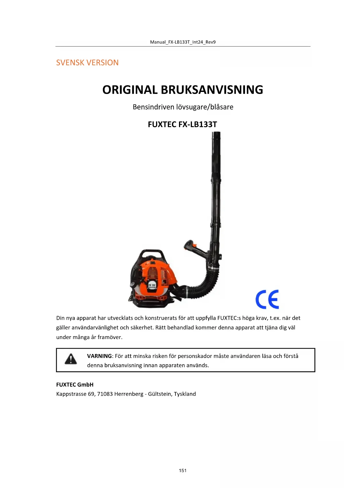 Din nya apparat har utvecklats och konstruerats för att uppfylla FUXTEC:s höga krav, t.ex. när det gäller användarvänlighet och säkerhet. Rätt behandlad kommer denna apparat att tjäna dig väl under många år framöver. VARNING: För att minska risken för personskador måste användaren läsa och förstå denna bruksanvisning innan apparaten används. FUXTEC GmbH Kappstrasse 69, 71083 Herrenberg - Gültstein, TysklandManual_FX-LB133T_Int24_Rev9
