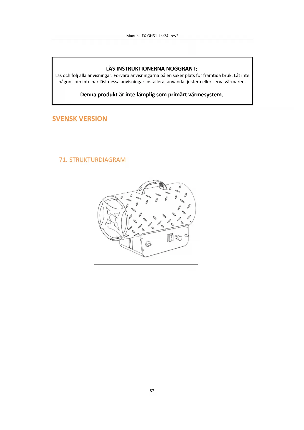 LÄS INSTRUKTIONERNA NOGGRANT: Läs och följ alla anvisningar. Förvara anvisningarna på en säker plats för framtida bruk. Låt inte någon som inte har läst dessa anvisningar installera, använda, justera eller serva värmaren. Denna produkt är inte lämplig som primärt värmesystem.Manual_FX-GH51_Int24_rev2