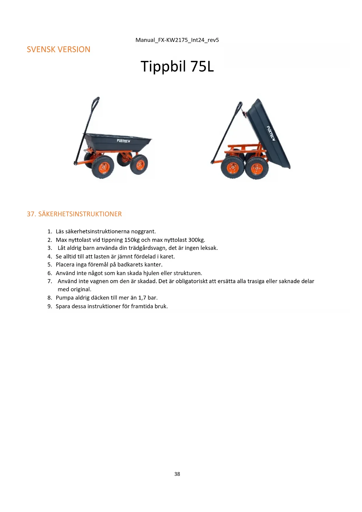 Nyttolast vid tippning inte överstiger 150kg och maximal nyttolast 300kg.Manual_FX-KW2175_Int24_rev5