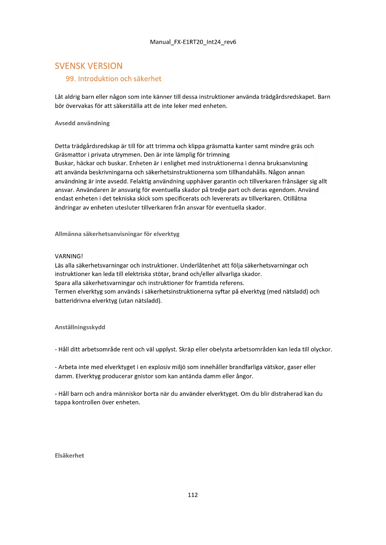 - Undvik onormal hållning. Håll det säkert Stå och upprätthåll balansen hela tiden. Detta gör att du bättre kan kontrollera grästrimmern i oväntade situationer och i särskilt sluttande områden. - Arbeta inte med grästrimmern i en explosiv miljö som innehåller brandfarliga vätskor, gaser eller damm. Grästrimmern kan producera gnistor som kan antända damm eller ångor. - Var extra försiktig när du går baklänges. Det finns risk att snubbla! - Gå bara i gångtakt. - När du avbryter arbetet, lämna aldrig enheten utan uppsikt och förvara den på en säker plats.Manual_FX-E1RT20_Int24_rev6