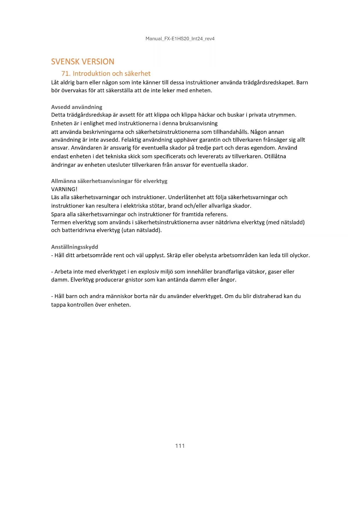 Före användning - Innan arbetet påbörjas ska du bekanta dig med häcksaxen och dess funktioner och reglage. - Kontrollera enheten för tecken på slitage eller skador före användning och efter en kollision . - Använd inte en enhet vars strömbrytare är defekt och inte längre kan slås på eller av. - Kontrollera att alla muttrar, bultar och skruvar är åtdragna för att säkerställa att enheten fungerar säkert. - Använd aldrig en enhet med skadade eller saknade delar. Låt en kvalificerad specialist eller fackverkstad reparera eller byta ut dem vid behov. - När du arbetar med eller på enheten, använd alltid stadiga skor, långbyxor och lämplig personlig skyddsutrustning (skyddsglasögon, hörselskydd, halkfria arbetshandskar, etc.). Att bära personlig skyddsutrustning minskar risken för skador. - Bär inte smycken eller löst sittande kläder som kan fångas av häcksaxen. Håll långt hår borta från klippenheten. - Ta bort eventuella justeringsverktyg eller skiftnycklar innan du slår på häcksaxen. Ett verktyg eller nyckel som finns i en rörlig del av enheten kan orsaka skada. När utplacerad - Använd inte enheten om det finns människor (särskilt barn) eller djur i omedelbar närhet. - Sluta arbeta om du märker att människor (särskilt barn) eller husdjur finns i närheten. - Håll alltid händer och fötter borta från rörliga knivar, särskilt när du slår på häcksaxen. - Undvik onormal hållning. Håll det säkert Stå och upprätthåll balansen hela tiden. Detta gör att du bättre kan kontrollera häcksaxen i oväntade situationer och i särskilt sluttande områden. - Arbeta inte med häcksaxen i en explosiv miljö som innehåller brandfarliga vätskor, gaser eller damm. Häcksaxen kan ge gnistor som kan antända dammet eller ångorna. - Var extra försiktig när du går baklänges. Det finns risk att snubbla! - Gå bara i gångtakt. - När du avbryter arbetet, lämna aldrig enheten utan uppsikt och förvara den på en säker plats. - Håll alla kroppsdelar borta från skärbladet. Försök inte att ta bort klipp eller hålla i material som ska skäras medan bladet är igång. Ta bort allt som har fastnatManual_FX-E1HS20_Int24_rev4