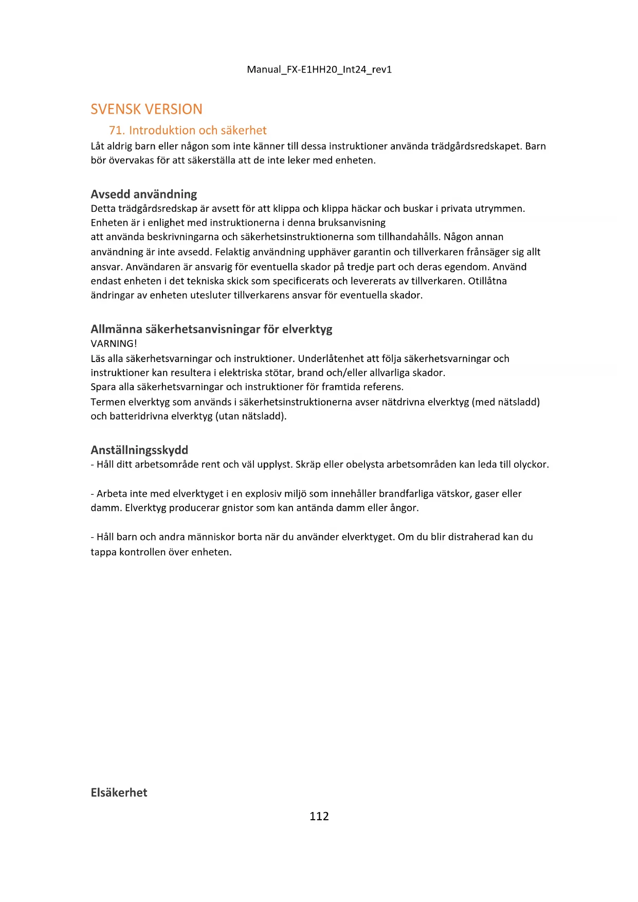 - Bär lämpliga kläder. Bär inte löst sittande kläder eller smycken. Håll hår, kläder och handskar borta från rörliga delar. Lösa kläder, smycken eller långt hår kan fastna i rörliga delar. Användning och hantering av elverktyget - Överbelasta inte enheten. Använd det avsedda elverktyget för ditt arbete. Med rätt elverktyg kan du arbeta bättre och säkrare inom det specificerade prestandaområdet. - Använd inte ett elverktyg vars brytare är defekt. Ett elverktyg som inte längre kan slås på eller av är farligt och måste repareras. - Koppla ur enheten och/eller ta bort batteriet innan du gör justeringar på enheten, byter tillbehör eller lägger undan enheten. Denna försiktighetsåtgärd förhindrar att elverktyget startas oavsiktligt. - Förvara oanvända elverktyg utom räckhåll för barn. Tillåt inte någon att använda enheten som inte är bekant med den eller dessa instruktioner har inte läst. Elverktyg är farliga när de används av oerfarna personer. - Underhåll elverktyg med omsorg. Kontrollera om rörliga delar fungerar korrekt och inte fastnar, om delar är trasiga eller skadade på ett sådant sätt att funktionen hos elverktyget är skadat. Låt skadade delar reparera innan du använder enheten. Många olyckor orsakas av dåligt underhållna elverktyg. - Håll skärverktyg vassa och rena. Noggrant underhållna skärverktyg med vassa skäreggar är mindre benägna att fastna och är lättare att leda. - Använd elverktyg, tillbehör, appliceringsverktyg etc. enligt dessa instruktioner. Ta hänsyn till arbetsförhållandena och den verksamhet som ska utföras. Användning av elverktyg för andra tillämpningar än de avsedda kan leda till leda till farliga situationer. Användning och hantering av det sladdlösa verktyget - Ladda endast batterierna med laddare som rekommenderas av tillverkaren. En laddare designad för en specifik typ av batteri skapar en brandrisk när den används med andra batterier. - Använd endast batterier avsedda för detta ändamål i elverktygen. Användning av andra batterier kan leda till skador och risk för brand. - Håll det oanvända batteriet borta från gem, mynt, nycklar, spikar, skruvar eller andra små metallföremål som kan orsaka överbryggning av kontakterna. En kortslutning mellan batterikontakterna kan orsaka brännskador eller resultera i brand. - Vid felaktig användning kan vätska läcka från batteriet. Undvik kontakt med den. Vid oavsiktlig kontakt, skölj med vatten. Om vätskan kommer i dina ögon, sök ytterligare läkarvård. Läckande batterivätska kan orsaka hudirritation eller orsaka brännskador.Manual_FX-E1HH20_Int24_rev1