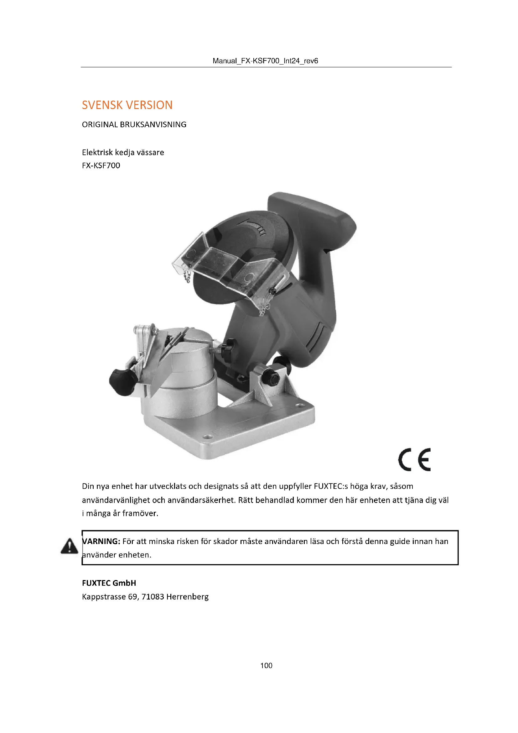 SVENSK VERSION ORIGINAL BRUKSANVISNING Elektrisk kedja vässare FX-KSF700 Din nya enhet har utvecklats och designats så att den uppfyller FUXTEC:s höga krav, såsom användarvänlighet och användarsäkerhet. Rätt behandlad kommer den här enheten att tjäna dig väl i många år framöver. VARNING: För att minska risken för skador måste användaren läsa och förstå denna guide innan han använder enheten. FUXTEC GmbH Kappstrasse 69, 71083 HerrenbergManual_FX-KSF700_Int24_rev6