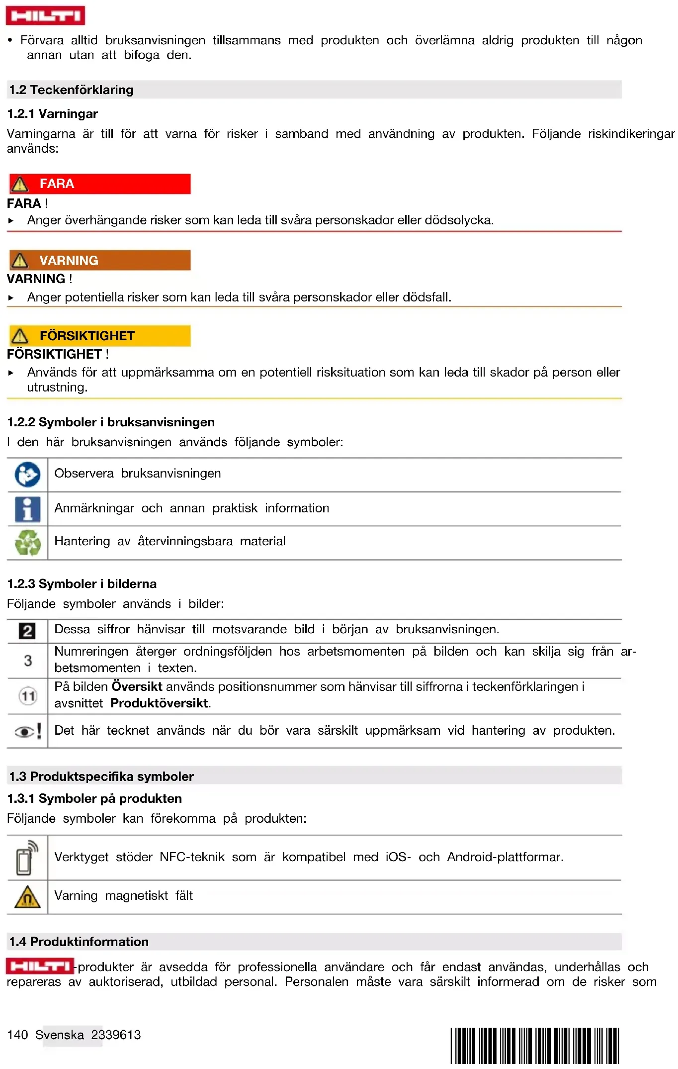 Den beskrivna produkten är ett passivt exoskelett. Syftet med det är att avlasta axlar och skuldror vid arbeten över huvudet och axlarna. Produkten är endast avsedd som hjälpmedel för arbetare inom byggsektorn och industrin, och får bara användas av vuxna. Hilti har exoskelett i två olika storlekar. Skillnaden består i att armskålar, armskydd och armskålsremmar är olika stora. Underhållsarbeten får endast utföras i enlighet med produkthandboken. Produkten får endast användas och underhållas av auktoriserad, utbildad personal som har fått särskild information om de risker som finns.*2339613* 2339613 Svenska 143
