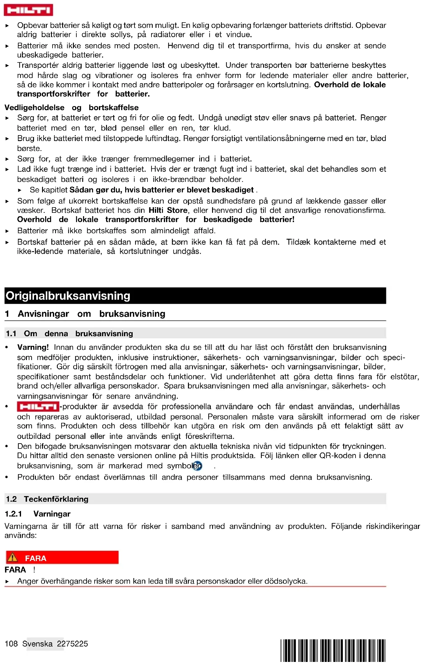 11 Tillverkargaranti ▶ Vänd dig till din lokala Hilti-representant om du har frågor om garantivillkoren.116 Svenska 2275225 *2275225* 12 Ytterligare information C 6-22 (01) RoHS (föreskrifter för begränsning av användningen av farliga ämnen) Tabellen gäller för den kinesiska marknaden.*2275225* 2275225 Svenska 117 Denna tabell gäller för den taiwanesiska marknaden. C 8-22 (01)118 Svenska 2275225 *2275225* RoHS (föreskrifter för begränsning av användningen av farliga ämnen) Tabellen gäller för den kinesiska marknaden.*2275225* 2275225 Svenska 119 Denna tabell gäller för den taiwanesiska marknaden. 13 Hilti-litiumjonbatterier Anvisningar för säkerhet och användning I denna dokumentation används begreppet batteri för Hiltis uppladdningsbara litiumjonbatterier där flera litiumjonceller har slagits samman. De är avsedda för Hiltis elverktyg och får endast användas till dessa. Använd endast originalbatterier från Hilti! Beskrivning Hilti-batterier är utrustade med cellhanterings- och cellskyddssystem. Batterierna består av celler som innehåller lagringsmaterial av litiumjoner, vilka möjliggör en hög specificerad energitäthet. Litiumjoncellerna utsätts för en väldigt liten minneseffekt, men reagerar kraftigt på ovarsam hantering, fullständig urladdning eller höga temperaturer. De produkter som är godkända för Hilti-batterier hittar du i din Hilti Store eller på: www.hilti.group Säkerhet ▶ Observera följande säkerhetsanvisningar för säker hantering och användning av litiumjonbatterier. Om åtgärderna inte följs kan det leda till hudirritation, svåra frätskador, kemiska brännskador, bränder och/eller explosioner. ▶ Hantera batterierna varsamt för att undvika skador och läckage av hälsovådliga syror! ▶ Batterier får absolut inte modifieras eller manipuleras! ▶ Batterier får inte tas isär, klämmas, hettas upp över 80 °C eller brännas. ▶ Använd inte och ladda inte batterier som har utsatts för slag eller på annat sätt är skadade. Kontrollera batterierna regelbundet för att se om de uppvisar tecken på skador. ▶ Använd aldrig återvunna eller reparerade batterier.120 Svenska 2275225 *2275225* ▶ Använd aldrig batteriet eller ett batteridrivet elverktyg som slagverktyg. ▶ Utsätt aldrig batterierna för direkt solljus, förhöjda temperaturer, gnistor eller öppna lågor. Detta kan leda till explosioner. ▶ Rör inte batteripolerna med dina fingrar, verktyg, smycken eller andra elektriskt ledande föremål av metall. Detta kan skada batteriet och orsaka såväl materiella skador som personskador. ▶ Håll batterierna borta från regn, väta och vätskor. Fukt som tränger sig in kan orsaka kortslutningar, elstötar, brännskador och explosioner. ▶ Använd endast batteriladdare och elverktyg som är avsedda för denna typ av batteri. Läs också igenom uppgifterna i motsvarande bruksanvisning. ▶ Använd inte och förvara inte batteriet i explosionsfarliga miljöer. ▶ Om batteriet är så hett att du inte kan ta i det kan det vara defekt. Ställ batteriet på en plats där inget riskerar att fatta eld och på betryggande avstånd från brännbart material. Låt batteriet svalna. Om batteriet efter en timme fortfarande är så hett att det inte går att ta i är det defekt. Följ anvisningarna i kapitel Åtgärder vid batteribrand. Hantering av skadade batterier ▶ Kontakta alltid din Hilti-servicepartner om ett batteri är skadat. ▶ Använd aldrig ett batteri som läcker syra. ▶ Undvik att läckande batterisyra kommer i direkt kontakt med ögonen eller huden. Bär alltid skydds- handskar och skyddsglasögon i samband med hantering av batterisyra. ▶ Använd ett för ändamålet godkänt kemiskt rengöringsmedel för att få bort batterisyra som läckt ut. Observera lokala rengöringsföreskrifter för batterisyra. ▶ Lägg det defekta batteriet i en icke brännbar behållare och täck det med torr sand, kritpulver (CaCO3) eller silikat (vermikulit). Sätt slutligen på locket så att det är lufttätt och förvara behållaren långt ifrån brännbara gaser, vätskor eller föremål. ▶ Kassera behållaren hos din Hilti Store eller vänd dig till närmaste återvinningscentral. Observera lokala transportföreskrifter för skadade batterier. Hantering av batterier som slutat fungera ▶ Se upp om batteriet beter sig onormalt, t.ex. om det inte laddar korrekt, har ovanligt lång laddningstid, uppvisar märkbart minskad arbetskapacitet, ovanliga LED-aktiviteter eller om det läcker batterisyra. Detta är tecken på invändiga problem. ▶ Kontakta Hilti-service om du misstänker att batteriet har ett invändigt problem. ▶ Om batteriet slutat fungera, inte längre vill ladda eller om det läcker batterisyra måste du kassera det. Se kapitel Underhåll och avfallshantering. Åtgärder vid batteribrand VARNING Faror vid batteribrand! Brinnande batterier utsöndrar farliga och explosiva vätskor och ångor som kan leda till frätskador, brännskador eller explosioner. ▶ Använd din personliga skyddsutrustning när du ska släcka en batteribrand. ▶ Se till att det finns god ventilation så att farliga och explosiva gaser kan ledas bort. ▶ Lämna rummet omedelbart vid intensiv rökutveckling. ▶ Uppsök läkare om du upplever irritation i luftvägarna. ▶ Ring 112 innan du påbörjar släckningsförsök. ▶ Släck batteribränder med enbart vatten från längsta möjliga avstånd. Pulversläckare och brandfiltar har ingen verkan på litiumjonbatterier. Bränder i batteriets närhet kan bekämpas med vedertagna släckningsmedel. ▶ Försök inte att flytta på stora mängder brinnande batterier. Avlägsna icke berörda material i batteriets närhet för att isolera de berörda batterierna. Om ett batteri ryker, brinner eller inte svalnar: ▶ Ta upp batteriet med en spade och lägg det i en hink med vatten. Den kylande effekten minskar den övergripande risken för brand i de battericeller s