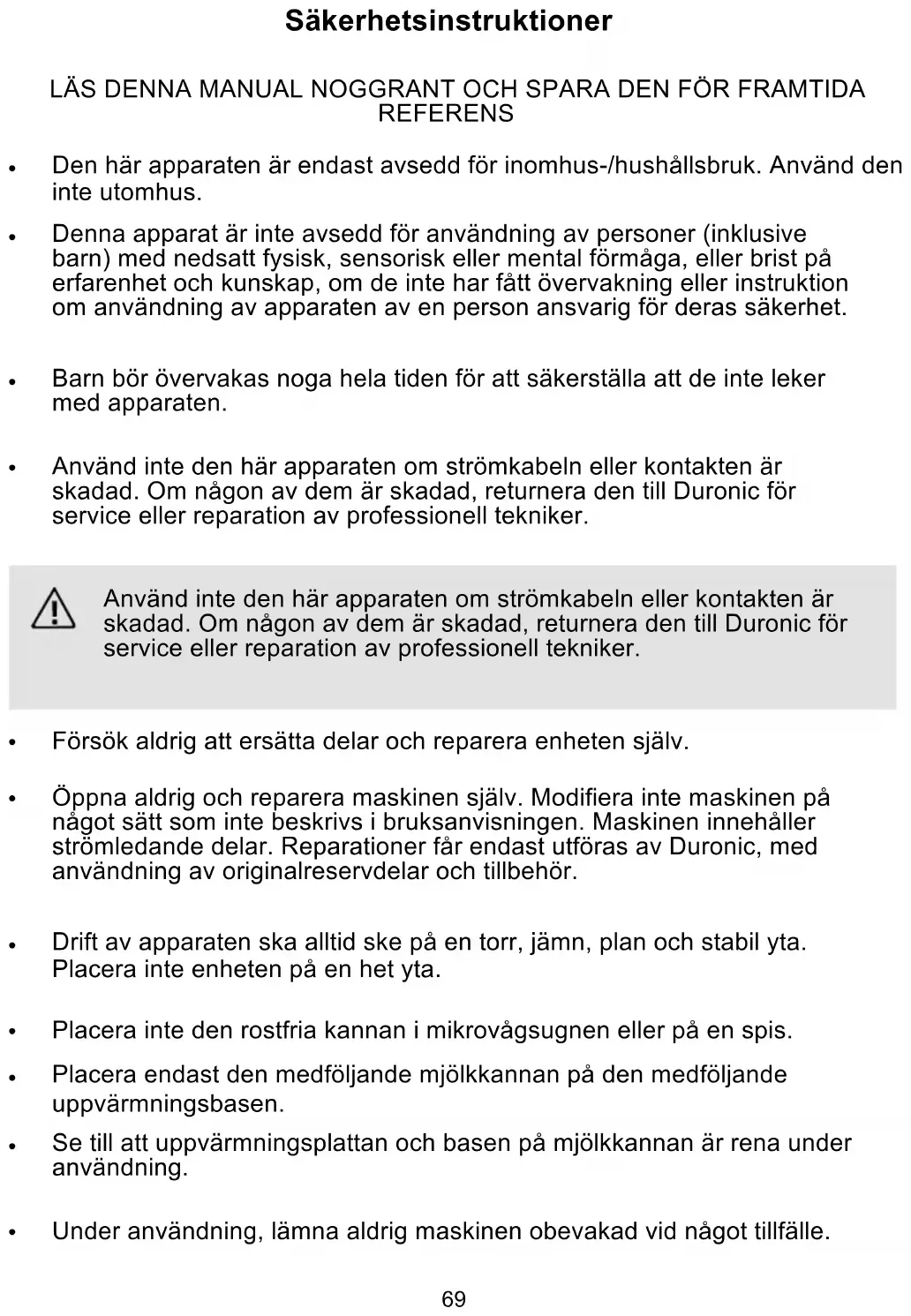 Se till att uppvärmningsplattan och basen på mjölkkannan är rena under användning. Under användning, lämna aldrig maskinen obevakad vid något tillfälle. Använd inte den här apparaten om strömkabeln eller kontakten är skadad. Om någon av dem är skadad, returnera den till Duronic för service eller reparation av professionell tekniker.70