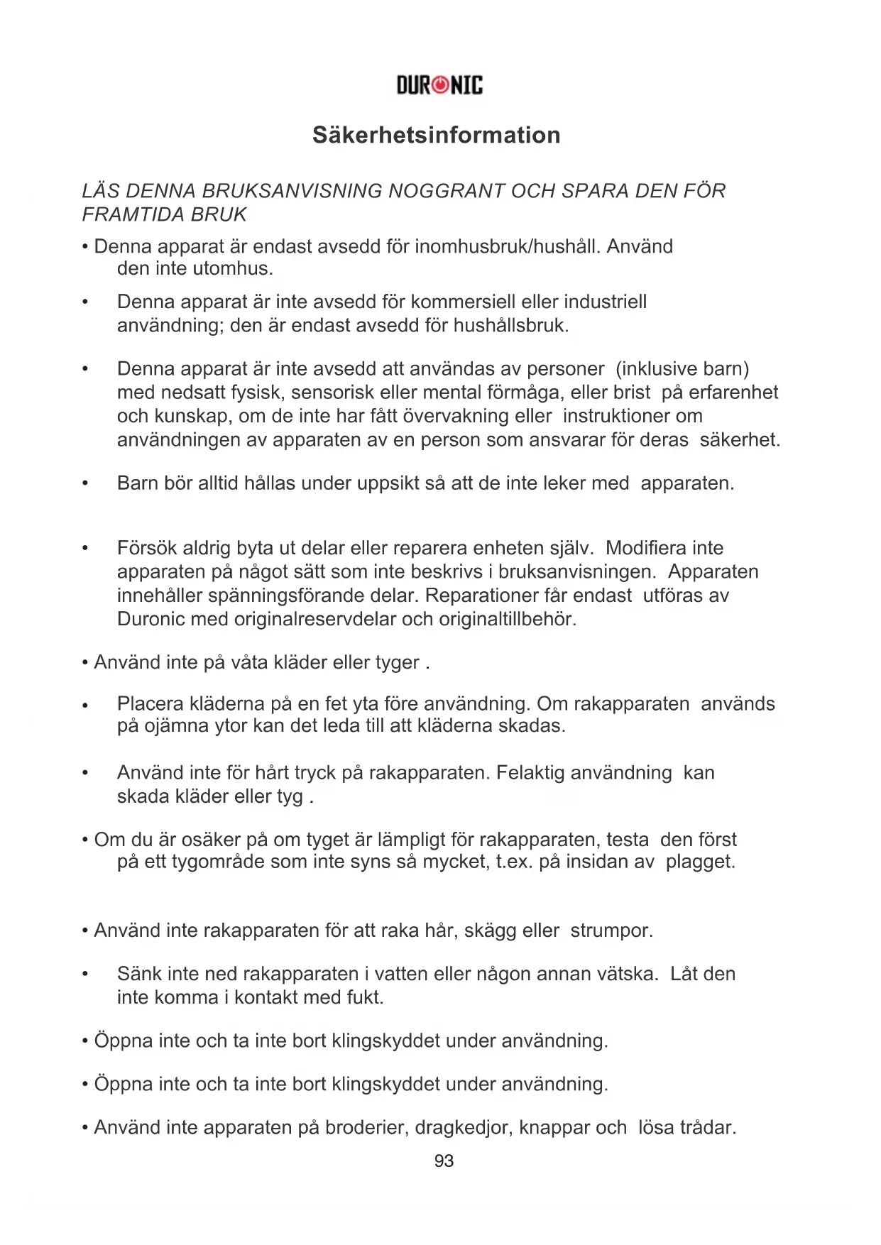 Försök aldrig byta ut delar eller reparera enheten själv. Modifiera inte apparaten på något sätt som inte beskrivs i bruksanvisningen. Apparaten innehåller spänningsförande delar. Reparationer får endast utföras av Duronic med originalreservdelar och originaltillbehör.