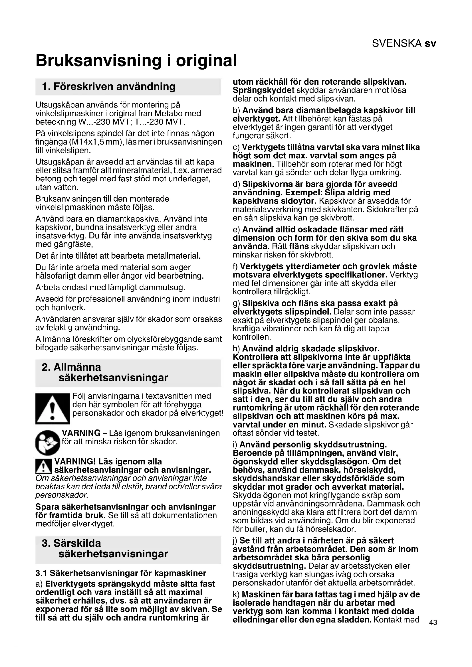 Bruksanvisning i original Utsugskåpan används för montering på vinkelslipmaskiner i original från Metabo med beteckning W...-230 MVT; T...-230 MVT. På vinkelslipens spindel får det inte finnas någon fingänga (M14x1,5 mm), läs mer i bruksanvisningen till vinkelslipen. Utsugskåpan är avsedd att användas till att kapa eller slitsa framför allt mineralmaterial, t.ex. armerad betong och tegel med fast stöd mot underlaget, utan vatten. Bruksanvisningen till den monterade vinkelslipmaskinen måste följas. Använd bara en diamantkapskiva. Använd inte kapskivor, bundna insatsverktyg eller andra insatsverktyg. Du får inte använda insatsverktyg med gängfäste, Det är inte tillåtet att bearbeta metallmaterial. Du får inte arbeta med material som avger hälsofarligt damm eller ångor vid bearbetning. Arbeta endast med lämpligt dammutsug. Avsedd för professionell användning inom industri och hantverk. Användaren ansvarar själv för skador som orsakas av felaktig användning. Allmänna föreskrifter om olycksförebyggande samt bifogade säkerhetsanvisningar måste följas. Följ anvisningarna i textavsnitten med den här symbolen för att förebygga personskador och skador på elverktyget! VARNING – Läs igenom bruksanvisningen för att minska risken för skador. VARNING! Läs igenom alla säkerhetsanvisningar och anvisningar. Om säkerhetsanvisningar och anvisningar inte beaktas kan det leda till elstöt, brand och/eller svåra personskador. Spara säkerhetsanvisningar och anvisningar för framtida bruk. Se till så att dokumentationen medföljer elverktyget.
