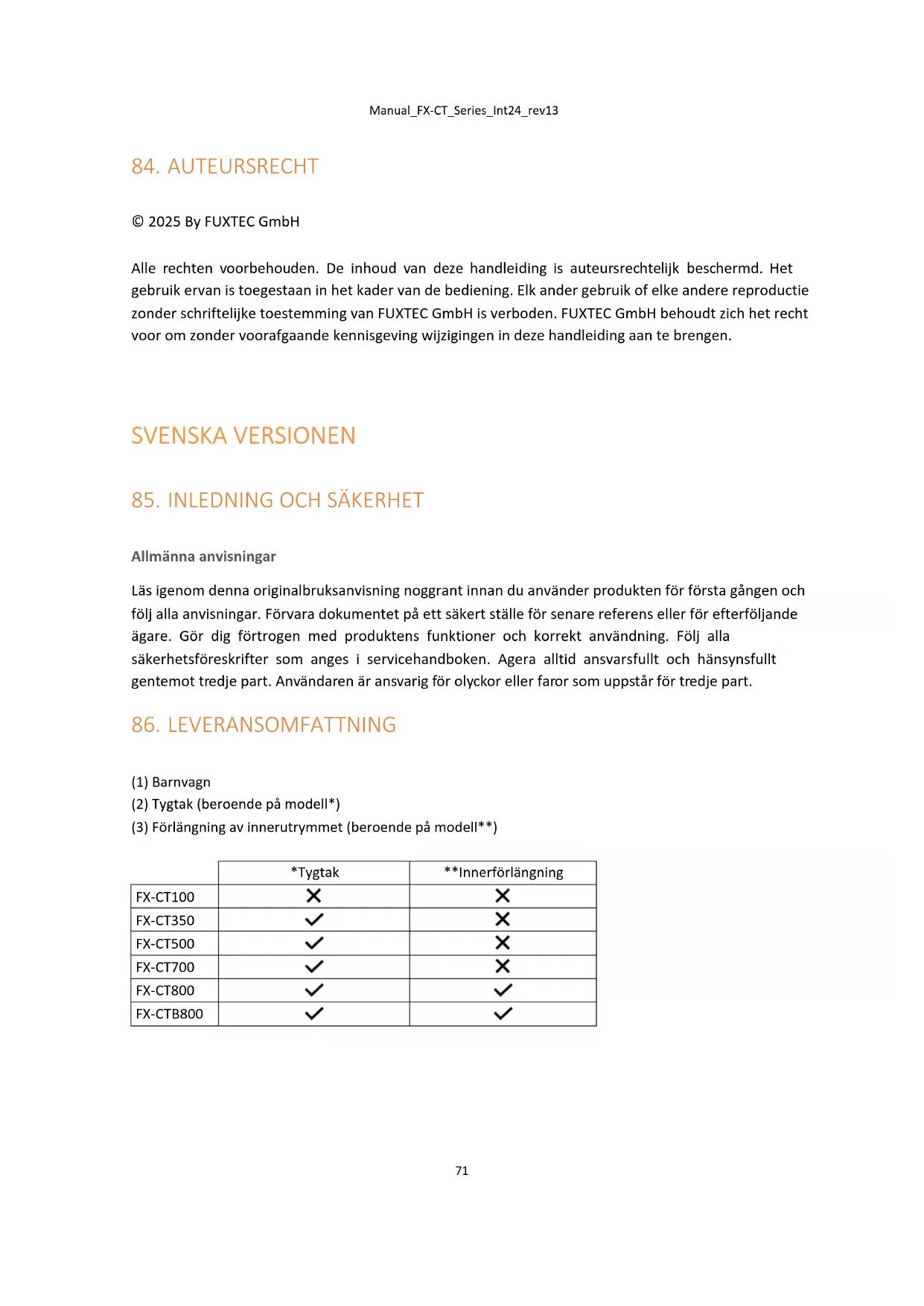 Vid frågor om garanti, reparation eller reservdelar, vänligen kontakta: FUXTEC GmbH Kappstraße 69 71083 Herrenberg Tyskland Telefon: 07032956088 E-post: info@fuxtec.de Observera: Skicka inte returer eller reparationer till denna adress. För returer inom ramen för garantin, vänligen kontakta vår kundtjänst.Manual_FX-CT_Series_Int24_rev13 80
