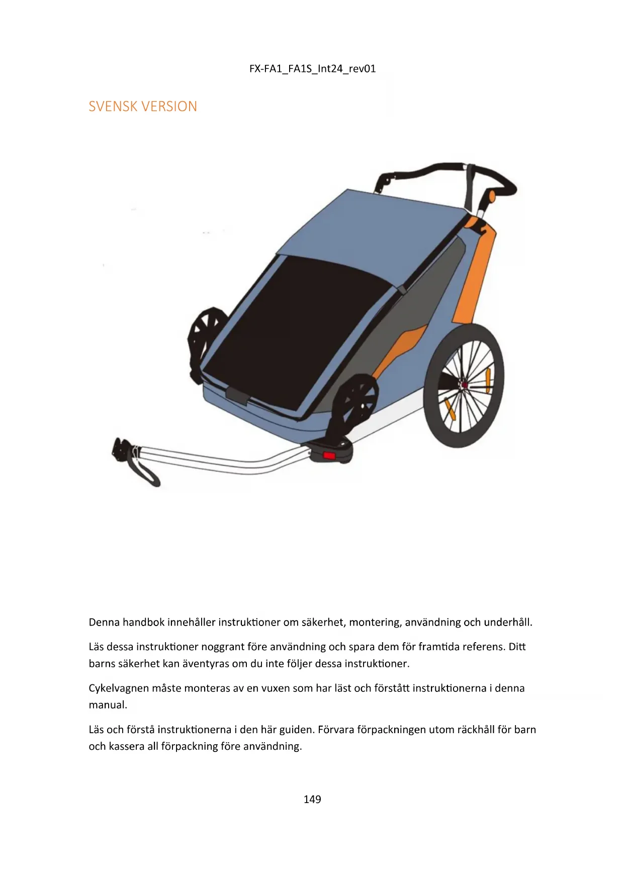 Denna handbok innehåller instrukoner om säkerhet, montering, användning och underhåll. Läs dessa instrukoner noggrant före användning och spara dem för framda referens. Di barns säkerhet kan äventyras om du inte följer dessa instrukoner. Cykelvagnen måste monteras av en vuxen som har läst och förstå instrukonerna i denna manual. Läs och förstå instrukonerna i den här guiden. Förvara förpackningen utom räckhåll för barn och kassera all förpackning före användning.FX-FA1_FA1S_Int24_rev01