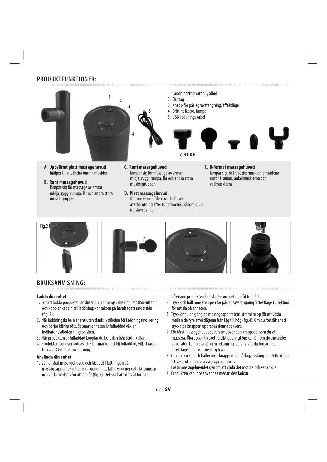 A B C D E62 I SV Hur man använder det uppvärmda platta massagehuvudet Det uppvärmda platta massagehuvudet värms upp på bara 15 sekunder, perfekt för att lindra ömma muskler.