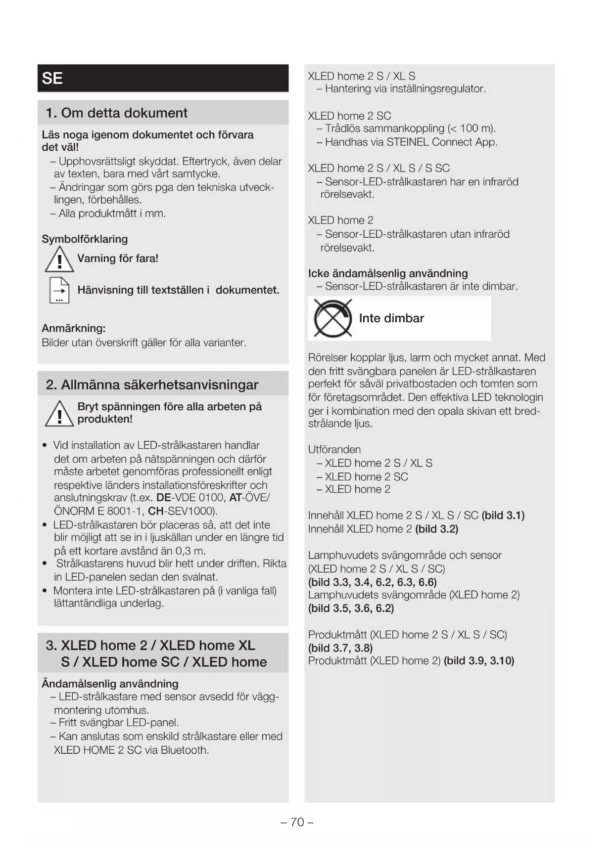 S/XLEDhome SC/XLEDhome Ändamålsenlig användning – LED-strålkastare med sensor avsedd för vägg- montering utomhus. – Fritt svängbar LED-panel. – Kan anslutas som enskild strålkastare eller med XLED HOME 2 SC via Bluetooth. XLEDhome2 S/XL S – Hantering via inställningsregulator. XLEDhome2 SC – Trådlös sammankoppling (<100m). – Handhas via STEINEL Connect App. XLED home 2 S/XL S/S SC – Sensor-LED-strålkastaren har en infraröd rörelsevakt. XLED home 2 – Sensor-LED-strålkastaren utan infraröd rörelsevakt. Icke ändamålsenlig användning – Sensor-LED-strålkastaren är inte dimbar. Inte dimbar Rörelser kopplar ljus, larm och mycket annat. Med den fritt svängbara panelen är LED-strålkastaren perfekt för såväl privatbostaden och tomten som för företagsområdet. Den eektiva LED teknologin ger i kombination med den opala skivan ett bred- strålande ljus. Utföranden – XLEDhome2 S/XL S – XLEDhome2SC – XLEDhome2 Innehåll XLED home 2 S/XL S/SC (bild3.1) Innehåll XLEDhome2 (bild3.2) Lamphuvudets svängområde och sensor (XLED home 2 S/XL S/SC) (bild3.3, 3.4, 6.2, 6.3, 6.6) Lamphuvudets svängområde (XLEDhome2) (bild3.5, 3.6, 6.2) Produktmått (XLED home 2 S/XL S/SC) (bild3.7, 3.8) Produktmått (XLEDhome2) (bild3.9, 3.10)– 71 – Översikt över enheter (XLED home 2 S/XL S/SC) (bild3.11) A LED-panel B Kåpa C Väggfäste D Sensorenhet E Efterlystid (XLED home 2 S/XLED home2XL S) F Skymningsinställning (XLED home 2 S/XLEDhome 2 XL S) Översikt över enheter (XLEDhome2) (bild3.12) A LED-panel B Kåpa C Väggfäste Ljusintensitetsfördelning (bild 3.13)