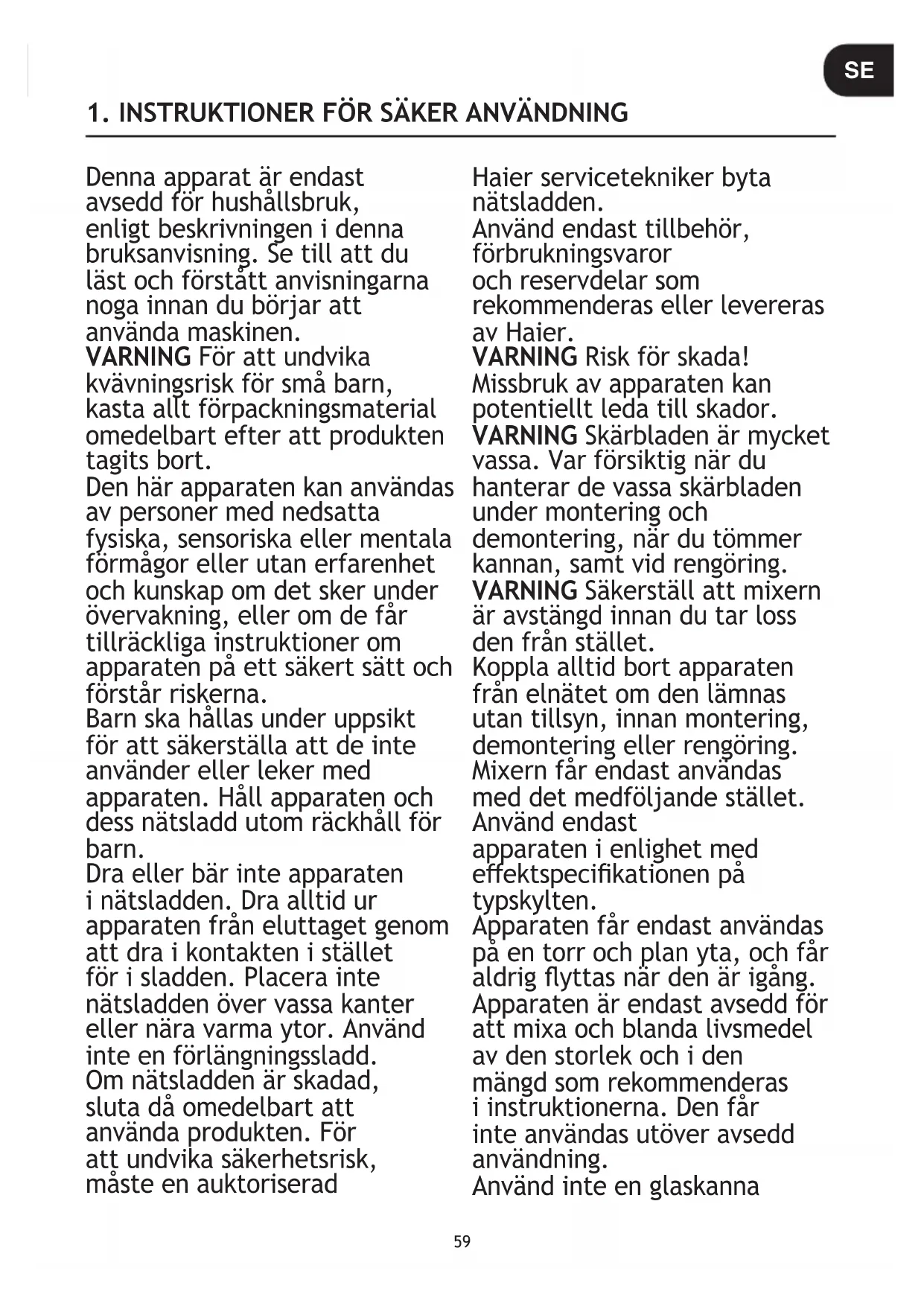 NO59 Denna apparat är endast avsedd för hushållsbruk, enligt beskrivningen i denna bruksanvisning. Se till att du läst och förstått anvisningarna noga innan du börjar att använda maskinen. VARNING För att undvika kvävningsrisk för små barn, kasta allt förpackningsmaterial omedelbart efter att produkten tagits bort. Den här apparaten kan användas av personer med nedsatta fysiska, sensoriska eller mentala förmågor eller utan erfarenhet och kunskap om det sker under övervakning, eller om de får tillräckliga instruktioner om apparaten på ett säkert sätt och förstår riskerna. Barn ska hållas under uppsikt för att säkerställa att de inte använder eller leker med apparaten. Håll apparaten och dess nätsladd utom räckhåll för barn. Dra eller bär inte apparaten i nätsladden. Dra alltid ur apparaten från eluttaget genom att dra i kontakten i stället för i sladden. Placera inte nätsladden över vassa kanter eller nära varma ytor. Använd inte en förlängningssladd. Om nätsladden är skadad, sluta då omedelbart att använda produkten. För att undvika säkerhetsrisk, måste en auktoriserad Haier servicetekniker byta nätsladden. Använd endast tillbehör, förbrukningsvaror och reservdelar som rekommenderas eller levereras av Haier. VARNING Risk för skada! Missbruk av apparaten kan potentiellt leda till skador. VARNING Skärbladen är mycket vassa. Var försiktig när du hanterar de vassa skärbladen under montering och demontering, när du tömmer kannan, samt vid rengöring. VARNING Säkerställ att mixern är avstängd innan du tar loss den från stället. Koppla alltid bort apparaten från elnätet om den lämnas utan tillsyn, innan montering, demontering eller rengöring. Mixern får endast användas med det medföljande stället. Använd endast apparaten i enlighet med eektspecikationen på typskylten. Apparaten får endast användas på en torr och plan yta, och får aldrig yttas när den är igång. Apparaten är endast avsedd för att mixa och blanda livsmedel av den storlek och i den mängd som rekommenderas i instruktionerna. Den får inte användas utöver avsedd användning. Använd inte en glaskanna