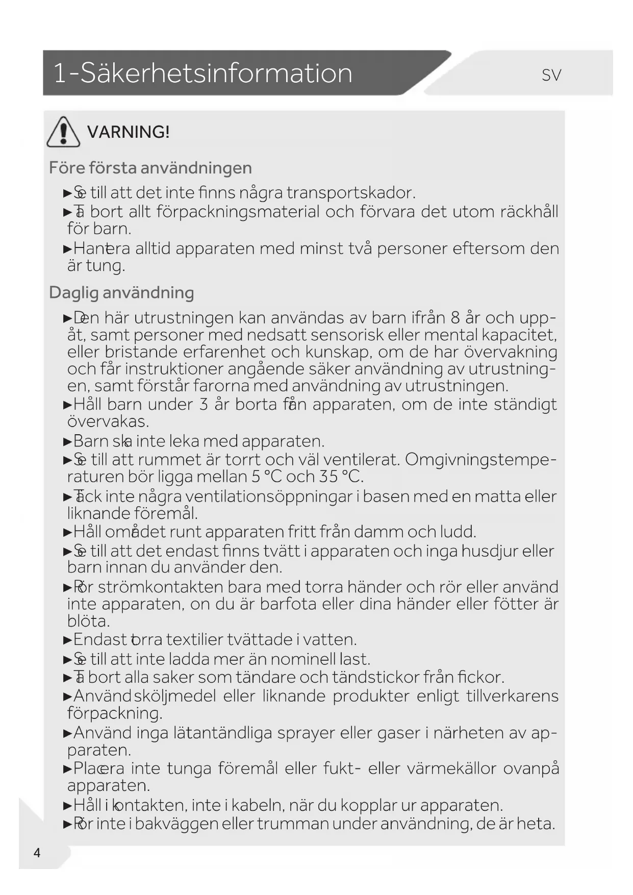 VARNING! Före första användningen ▶ S e till att det inte nns några transportskador. ▶ T a bort allt förpackningsmaterial och förvara det utom räckhåll för barn. ▶ Hant era alltid apparaten med minst två personer eftersom den är tung. Daglig användning ▶ D en här utrustningen kan användas av barn ifrån 8 år och upp- åt, samt personer med nedsatt sensorisk eller mental kapacitet, eller bristande erfarenhet och kunskap, om de har övervakning och får instruktioner angående säker användning av utrustning- en, samt förstår farorna med användning av utrustningen. ▶ Håll barn under 3 år borta fr ån apparaten, om de inte ständigt övervakas. ▶ Barn sk a inte leka med apparaten. ▶ S e till att rummet är torrt och väl ventilerat. Omgivningstempe- raturen bör ligga mellan 5 °C och 35 °C. ▶ T äck inte några ventilationsöppningar i basen med en matta eller liknande föremål. ▶ Håll omr ådet runt apparaten fritt från damm och ludd. ▶ S e till att det endast nns tvätt i apparaten och inga husdjur eller barn innan du använder den. ▶ R ör strömkontakten bara med torra händer och rör eller använd inte apparaten, on du är barfota eller dina händer eller fötter är blöta. ▶ Endast t orra textilier tvättade i vatten. ▶ S e till att inte ladda mer än nominell last. ▶ T a bort alla saker som tändare och tändstickor från ckor. ▶ Använd sköljmedel eller liknande produkter enligt tillverkarens förpackning. ▶ Använd inga lät tantändliga sprayer eller gaser i närheten av ap- paraten. ▶ Plac era inte tunga föremål eller fukt- eller värmekällor ovanpå apparaten. ▶ Håll i k ontakten, inte i kabeln, när du kopplar ur apparaten. ▶ R ör inte i bakväggen eller trumman under användning, de är heta.SV