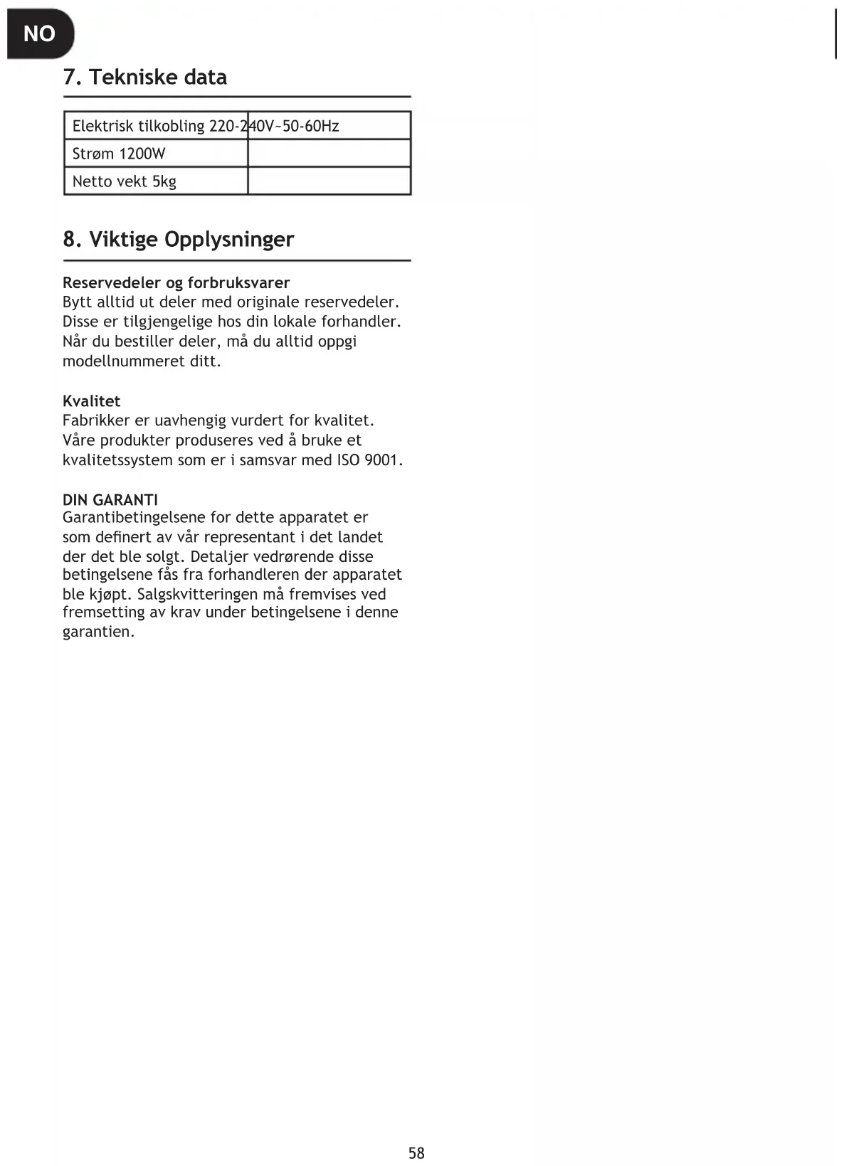 DIN GARANTI Garantivillkoren för produkten denieras av vår representant i det land där produkten säljs. Du kan få uppgifter om aktuella villkor från återförsäljaren. Kvittot måste visas upp när man kräver ersättning enligt garantin. Elektrisk anslutning 220-240V~50-60Hz Ström 1200W Nettovikt 5kg