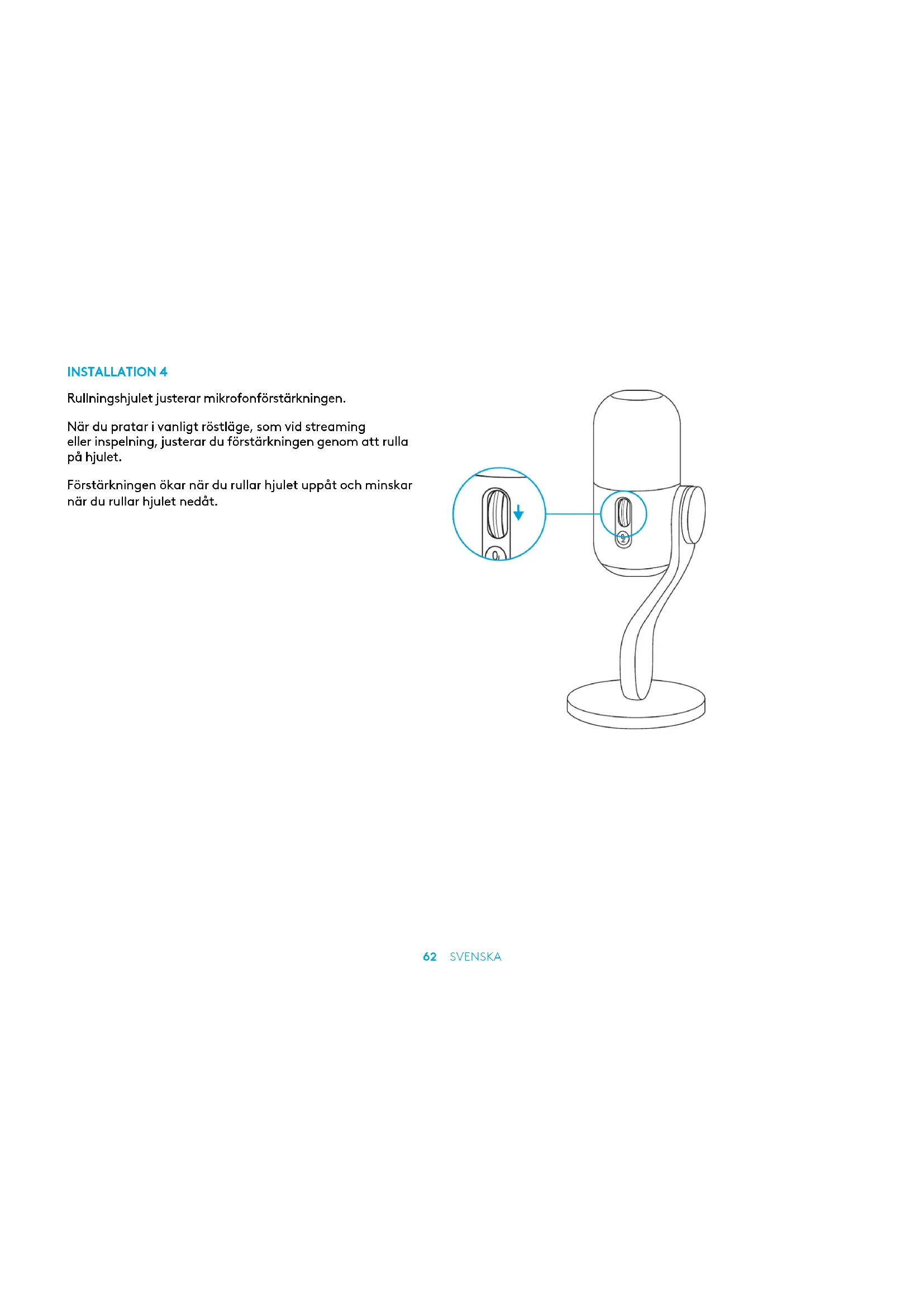 Source SettingsDesktop AudioGlobal SettingsMic/AuxDevice Microophone (2-Yeti GX) 10062 SVENSKA INSTALLATION 4 Rullningshjulet justerar mikrofonförstärkningen. När du pratar i vanligt röstläge, som vid streaming ellerinspelning, justerar du förstärkningen genom att rulla på hjulet. Förstärkningen ökar när du rullar hjulet uppåt och minskar när du rullar hjulet nedåt.63 SVENSKA INSTALLATION 5 Indikatorlampan på rullningshjulet visar också om mikrofonen används.