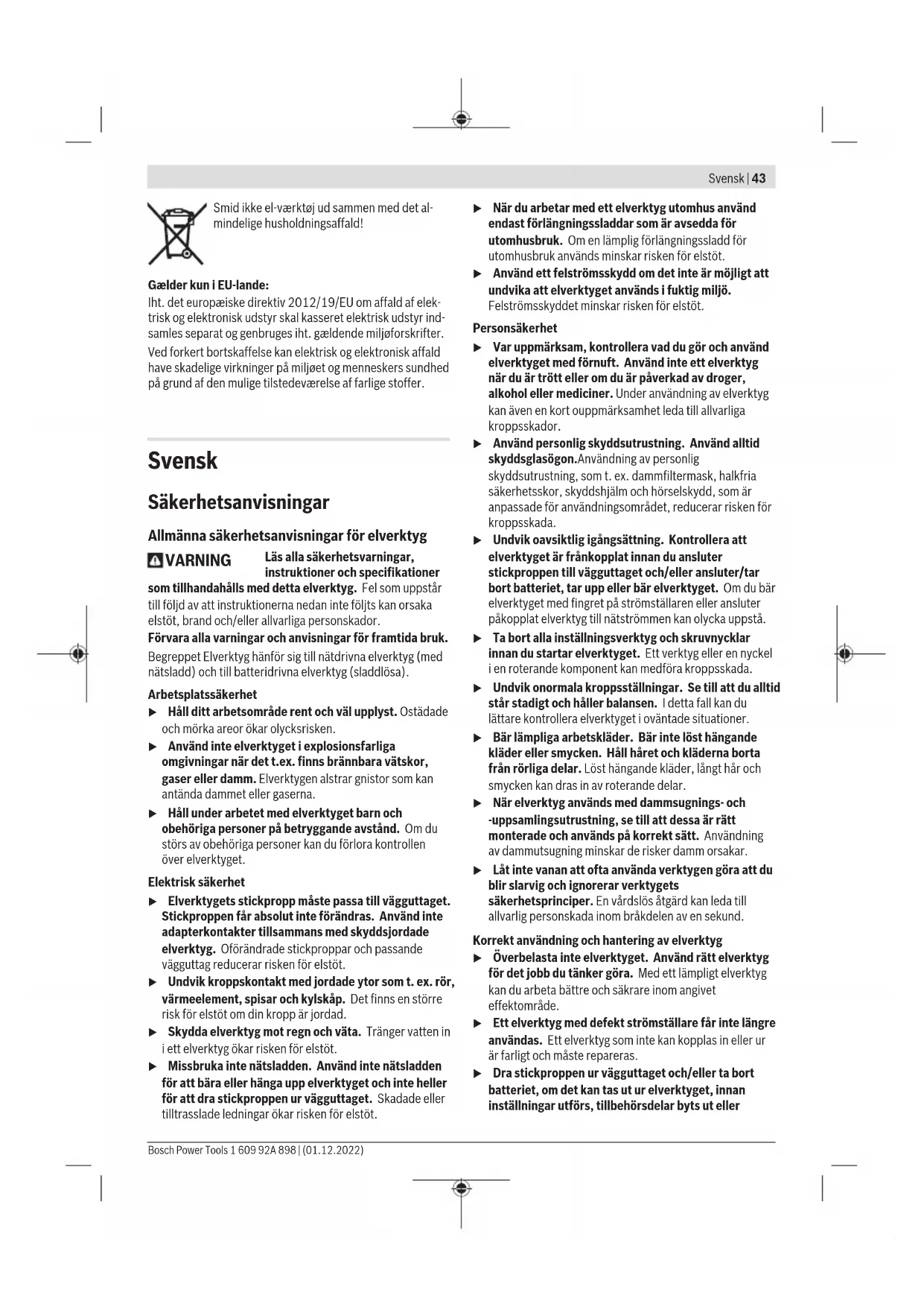 Den vibrationsnivå och det bullervärde som anges i dessa anvisningar har uppmätts enligt en mätmetod som normerats och kan användas för att jämföra elverktyg med varandra. Mätmetoden är även lämplig för preliminär bedömning av vibrations- och bullernivån. Den angivna vibrations- och bullernivån representerar den huvudsakliga användningen av elverktyget. Om däremot elverktyget används för andra ändamål, med andra insatsverktyg eller inte underhållits ordentligt kan vibrations- och bullernivån avvika. Då kan vibrations- och bullernivån under arbetsperioden öka betydligt under hela arbetstiden. För en exakt bedömning av vibrations- och bullernivån bör även de tider beaktas när elverktyget är avstängt eller är igång, men inte används. Detta reducerar vibrations- och bullerbelastningen för den totala arbetsperioden betydligt. Bestäm extra säkerhetsåtgärder för att skydda operatören mot vibrationernas inverkan t.ex.: underhåll av elverktyget och insatsverktygen, att hålla händerna varma, organisation av arbetsförloppen. Montage u Dra stickproppen ur nätuttaget innan arbeten utförs på elverktyget. Tilläggshandtag (se bild A) u Använd endast elverktyget med tilläggshandtaget(6). Du kan placera tilläggshandtaget (6) i 12 olika positioner för att få en säker och mindre uttröttande arbetsställning. Vrid handtaget på tilläggshandtaget (6) i vridriktning ➊ och skjut tilläggshandtaget (6) så långt framåt tills du kan svänga den till önskad position. Därefter drar du tillbaka tilläggshandtaget (6) igen och vrider fast det nedre handtaget i vridriktning ➋ igen. Ställa in borrdjupet (se bild A) Med justeringsringen (7) kan önskat borrdjup X fastställas. Vrid det nedre handtaget på stödhandtaget (6) motsols och sätt in djupanslaget (7). Dra ut djupanslaget (7) så att avståndet mellan borrspetsen och djupanslagets spets (7) motsvarar önskat borrdjup X. Dra därefter åt det nedre handtaget på stödhandtaget (6) medsols igen. Den räfflade sidan av djupanslaget (7) måste peka neråt. Verktygsbyte u Bär skyddshandskar vid verktygsbyte. Borrchucken kan bli väldigt varm vid långa arbetsprocesser. Kuggkranschuck (se bild B) Öppna kuggkranschucken (1) genom att vrida tills verktyget kan sättas in. Sätt in verktyget. Sätt in chucknyckeln (9) i hålen på kuggkranschucken (1) och spänn fast verktyget jämnt. Skruvverktyg (se bild C) Vid användning av skruvbits (10) bör man alltid använda en universalbitshållare (11). Använd endast skruvbits som passar till skruvhuvudet. Ställ alltid omkopplaren ”Borra/slagborra” (2) på symbolen ”Borra” vid skruvning. Damm-/spånutsugning Dammet från material som t.ex. blyhaltig målning, vissa träslag, mineraler och metall kan vara hälsovådligt. Beröring eller inandning av dammet kan orsaka allergiska reaktioner och/eller andningsbesvär hos användaren eller personer som uppehåller sig i närheten. Vissa damm från ek eller bok anses vara cancerogena, speciellt då i förbindelse med tillsatsämnen för Bosch Power Tools 1 609 92A 898 | (01.12.2022)46 | Svensk träbehandling (kromat, träkonserveringsmedel). Endast yrkesmän får bearbeta asbesthaltigt material. – Se till att arbetsplatsen är väl ventilerad. – Vi rekommenderar ett andningsskydd i filterklass P2. Beakta de föreskrifter som i aktuellt land gäller för bearbetat material. u Undvik dammanhopning på arbetsplatsen. Damm kan lätt självantändas. Byta borrchuck u På elverktyg utan borrspindellåsning måste borrchucken bytas hos en auktoriserad serviceverkstad förBosch- elverktyg. Chucken måste dras åt med ett åtdragningsmoment på ca. 30 – 35Nm. Drift Driftstart u Kontrollera nätspänningen! Kontrollera att strömkällans spänning överensstämmer med uppgifterna på elverktygets typskylt. Ställa in rotationsriktningen (se bild D – E) u Aktivera rotationsriktningsomkopplaren (5) endast när elverktyget står stilla. Med riktningsomkopplaren (5) kan elverktygets rotationsriktning ändras. Vid nedtryckt strömställare Till/ Från (4) kan omkoppling inte ske. Högergång: För att borra och skruva in skruvar skjuter du rotationsriktningsomkopplaren (5) till vänster ända till anslaget. Vänstergång: För att lossa och skruva ut skruvar och muttrar trycks riktningsomkopplaren (5) åt höger mot anslaget. Ställa in driftstyp Borra och skruva Ställ alltid omkopplaren (2) på symbolen ”Borra”. Slagborrning Ställ alltid omkopplaren (2) på symbolen ”Slagborrning”. Omkopplaren (2) snäpper fast och kan också manövreras när motorn är igång. In- och urkoppling Tryck för start av elverktyget ned strömställaren Till/Från (4) och håll den nedtryckt. För att fastställa den intryckta strömbrytaren, (4) tryck på spärrknappen (3). För att stänga av elverktyget släpper du strömbrytaren (4), eller om den är låst med spärrknappen (3) trycker du kort på strömbrytaren (4) och släpper den sedan. Ställ in varvtal/slagtal Varvtalet/slagtalet på inkopplat elverktyg kan justeras steglöst genom att mer eller mindre trycka ned på-/av- strömbrytaren (4). Ett lätt tryck på på-/av-strömbrytaren (4) ger ett lågt varvtal. Med tilltagande tryck ökar varvtalet/slagtalet. Arbetsanvisningar u Dra stickproppen ur nätuttaget innan arbeten utförs på elverktyget. u Elverktyget ska vara avstängt när det förs mot muttern/skruven. Roterande insatsverktyg kan slira bort. Efter en längre tids arbete med små varvtal bör du låta elverktyget rotera i 3 minuter vid maximalt varvtal och utan belastning. För att borra i kakel, ställ omkopplaren (2) på symbolen ”Borra”. Efter att kakelplattan har borrats igenom, ställ omkopplaren på symbolen ”Slagborrning” och arbeta med slag. Vid arbete i betong, sten och murverk, använd hårdmetallborr. Använd endast felfria, skarpa HSS-borr (HSS=high speed steel) vid borrning i metall. Motsvarande kvalitet garanterar Bosch till