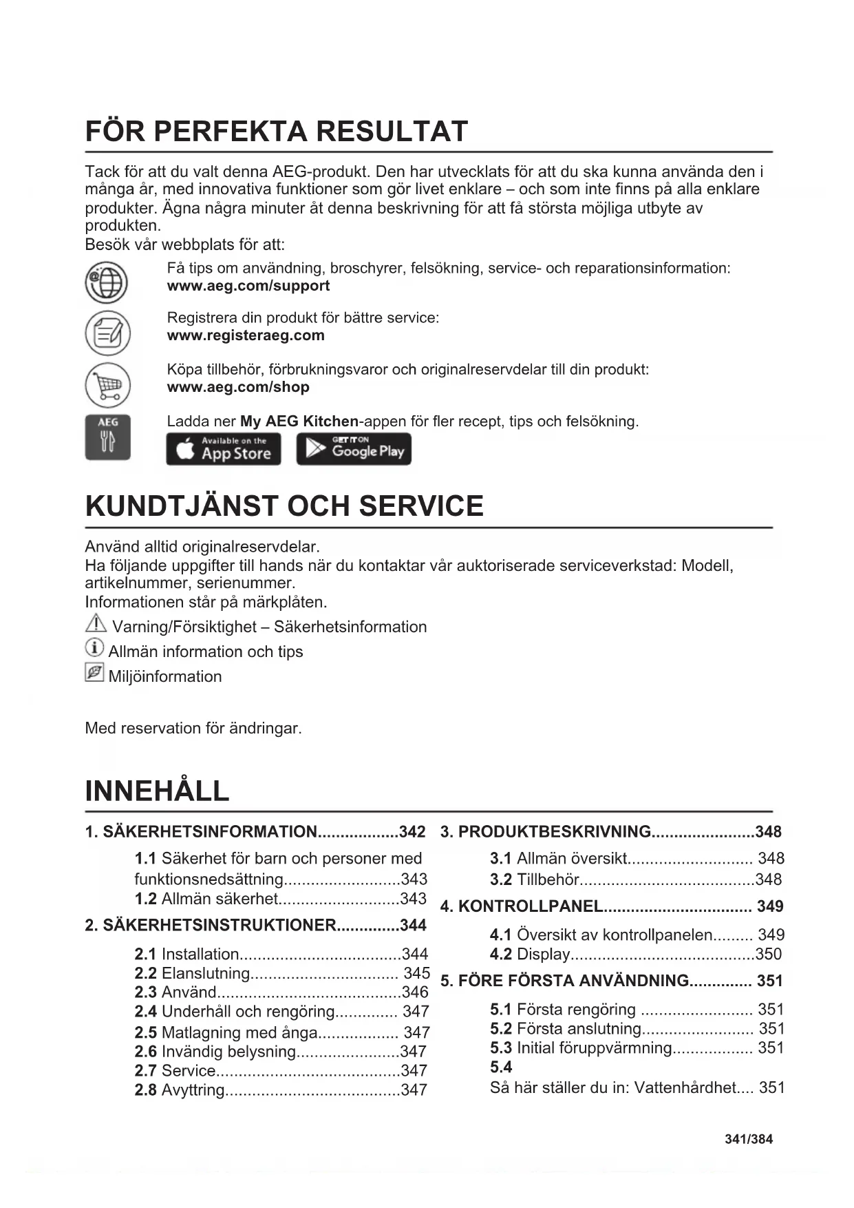 Resirkuler materialer som er merket med symbolet . Legg emballasjen i riktige beholdere for å resirkulere det. Bidrar til å beskytte miljøet, menneskers helse og for å resirkulere avfall av elektriske og elektroniske produkter. Ikke kast produkter som er merket med symbolet sammen med husholdningsavfallet. Produktet kan leveres der hvor tilsvarende produkt selges eller på miljøstasjonen i kommunen. Kontakt kommunen for nærmere opplysninger. 340/384 DET ER ENKELT!FÖR PERFEKTA RESULTAT Tack för att du valt denna AEG-produkt. Den har utvecklats för att du ska kunna använda den i många år, med innovativa funktioner som gör livet enklare – och som inte finns på alla enklare produkter. Ägna några minuter åt denna beskrivning för att få största möjliga utbyte av produkten. Besök vår webbplats för att: Få tips om användning, broschyrer, felsökning, service- och reparationsinformation: www.aeg.com/support Registrera din produkt för bättre service: www.registeraeg.com Köpa tillbehör, förbrukningsvaror och originalreservdelar till din produkt: www.aeg.com/shop Ladda ner My AEG Kitchen-appen för fler recept, tips och felsökning.