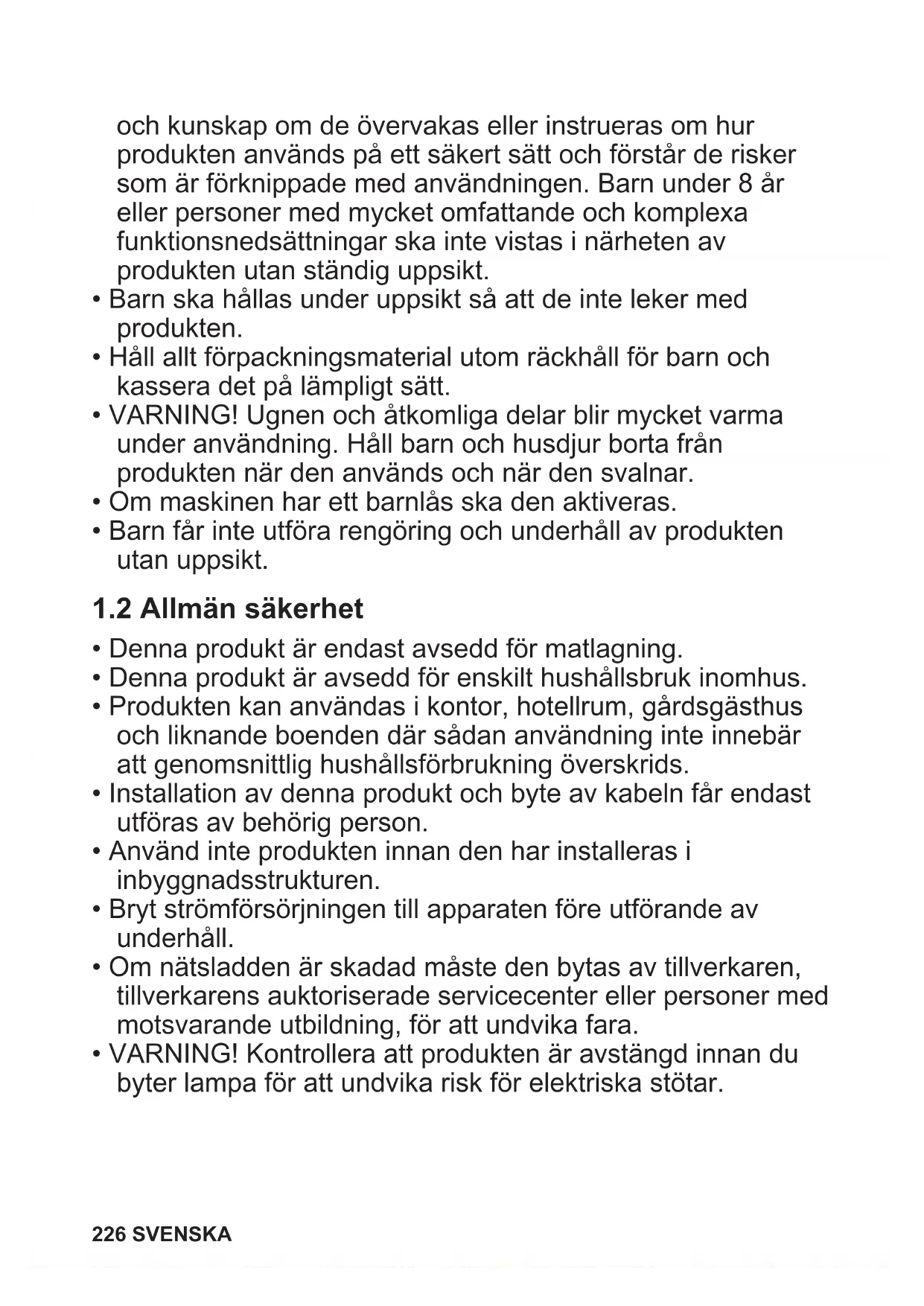 - VARNING! Kontrollera att produkten är avstängd innan du byter lampa för att undvika risk för elektriska stötar. 226 SVENSKA• VARNING! Ugnen och åtkomliga delar blir mycket varma under användning. Var försiktig så att du inte vidrör värmeelementen eller ugnsutrymmet.