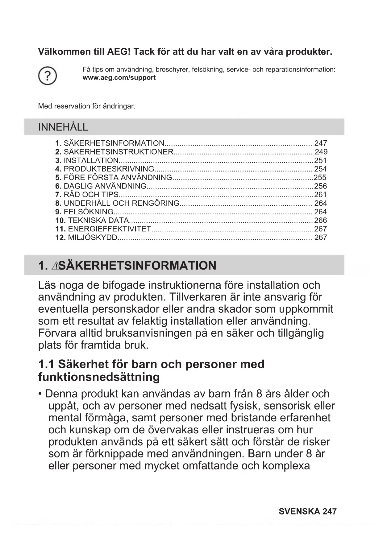 - Denna produkt kan användas av barn från 8 års ålder och uppåt, och av personer med nedsatt fysisk, sensorisk eller mental förmåga, samt personer med bristande erfarenhet och kunskap om de övervakas eller instrueras om hur produkten används på ett säkert sätt och förstår de risker som är förknippade med användningen. Barn under 8 år eller personer med mycket omfattande och komplexa SVENSKA 247funktionsnedsättningar ska inte vistas i närheten av produkten utan ständig uppsikt.