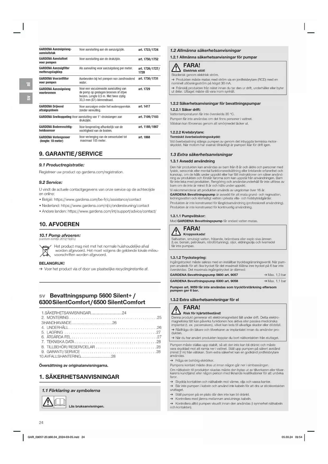 FARA! Risk för hjärtstillestånd!Denna produkt genererar ett elektromagnetiskt fält under drift. Detta elektro-magnetiska fält kan påverka funktionen hos aktiva eller passiva medicinska implantat (t. ex. pacemakers), vilket kan leda till allvarliga skador eller dödsfall. v Rådfråga din läkare och tillverkaren av implantatet innan du använder pro- dukten. v När du har använt produkten kopplar du bort nätkontakten från eluttaget. Pumpen måste ställas upp stabilt, så att den inte kan bli dränkt och måste vara skyddad mot att ramla ner i vattnet. Ställ upp pumpen på säkert avstånd (minst 2m) från vätskan. Som extra säkerhet kan en godkänd jordfelsbrytare användas.v Fråga en behörig elektriker.Pumpens kontakt måste dras ut innan någon går ner i simbassängen.Om nätkabeln till produkten skadas måste den bytas ut av tillverkaren eller tillver-karens kundtjänst eller någon person med liknande kvalifikationer för att undvika faror.v Skydda kontakten och nätkabeln mot värme, olja och vassa kanter. v Bär inte pumpen i kabeln och använd inte kabeln för att dra ur stickkontakten ur uttaget.v Ställ pumpen på en plats där den inte kan bli dränkt.v Kontrollera med jämna mellanrum anslutnings kabeln. v Kontrollera alltid pumpen visuellt innan den användas (i synnerhet nätkabeln och kontakten). GAR_09057-20.960.04_2024-03-05.indd 24GAR_09057-20.960.04_2024-03-05.indd 24 05.03.24 09:5405.03.24 09:54sv